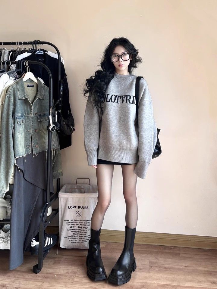 Главная страница > Серый свитер с буквенным принтом для женщин, осенне-зимний, свободный вязаный пуловер, повседневный универсальный стиль.