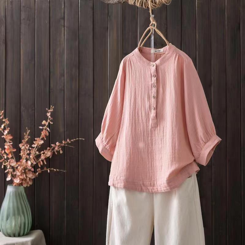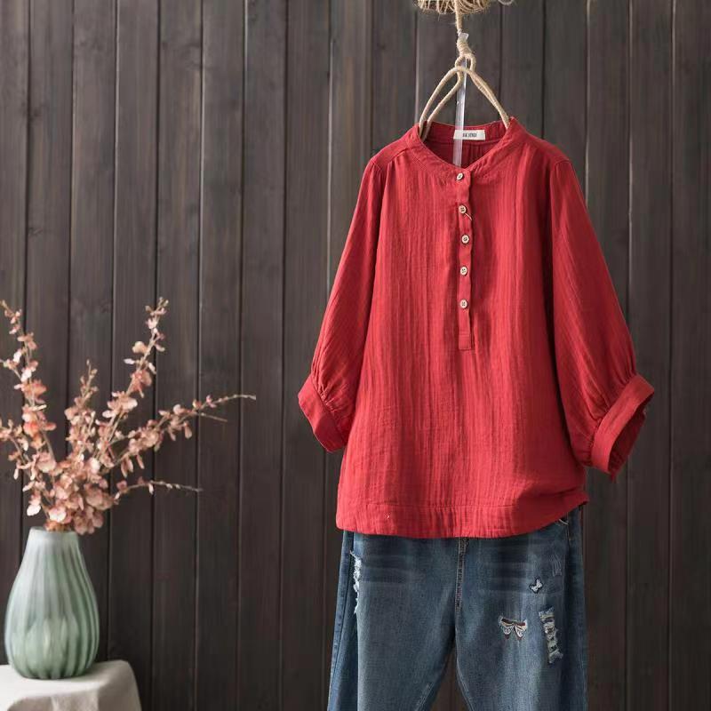 Главная страница > Женский пуловер в японском стиле, однотонная Свободная рубашка из хлопчатобумажной пряжи в художественном стиле, с вертикальным воротником, топ с семью рукавами