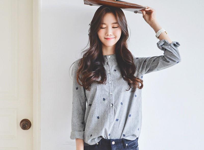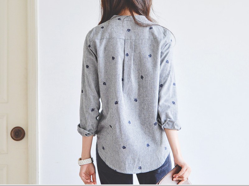 Главная страница > Рубашка в свежую полоску в Корейском стиле с воротником-стойкой и вышитыми листьями, приталенная рубашка с длинным рукавом для женщин