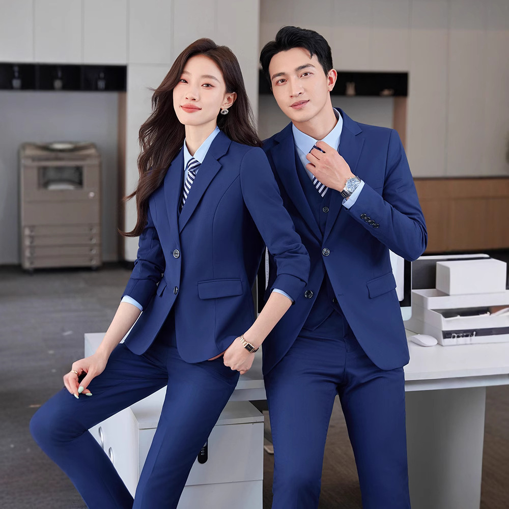 Женская модель - костюм королевского синего цвета + брюки + светло-серая рубашка.