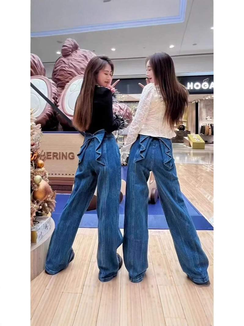 Главная страница > Лю Ифэй те же американские джинсы с бантом женские весенние и осенние новые корейские высокие талии свободные вертикальные брюки женские