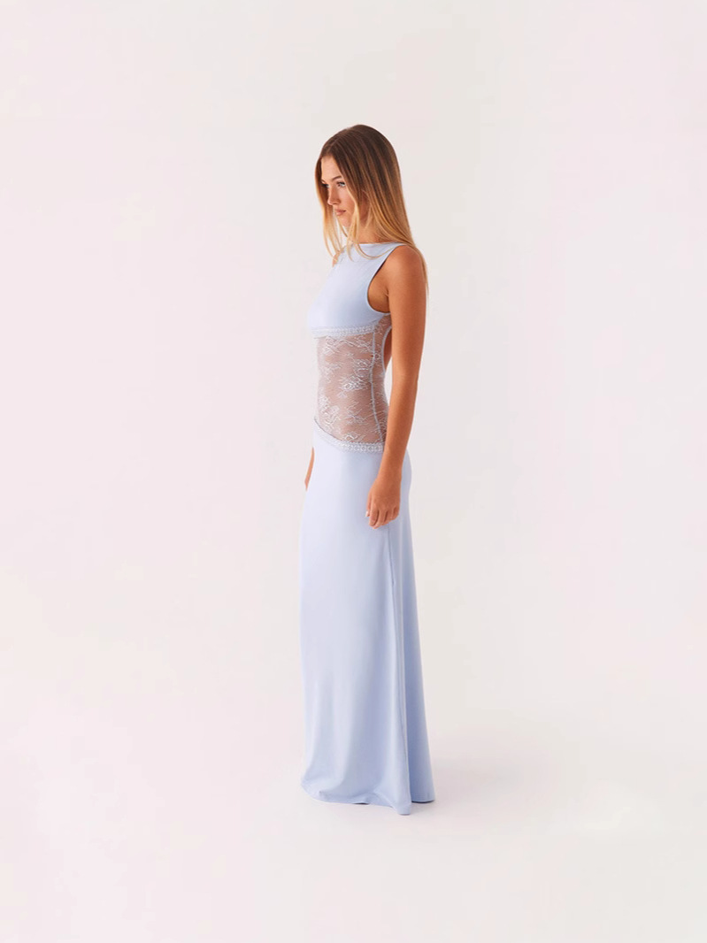 2025 новый европейский и американский трансграничный летний сексуальный тонкое кружево атласное сшитое длинное платье без спинки тонкое платье женское