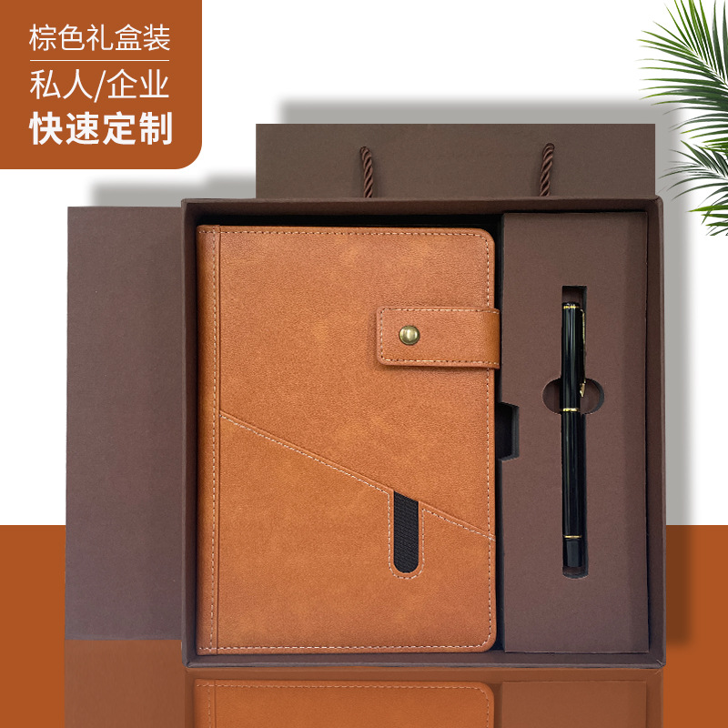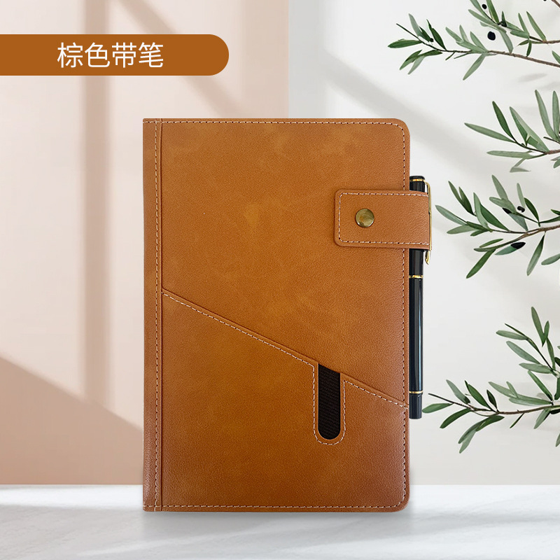 Сшитый блокнот A5 коричневого цвета с кнопочной застежкой (блокнот + ручка)