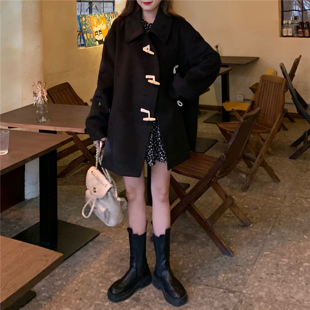 Главная страница > Новое осенне-зимнее свободное элегантное шерстяное пальто в Корейском стиле для коротких мужчин, черное шерстяное пальто средней длины для женщин