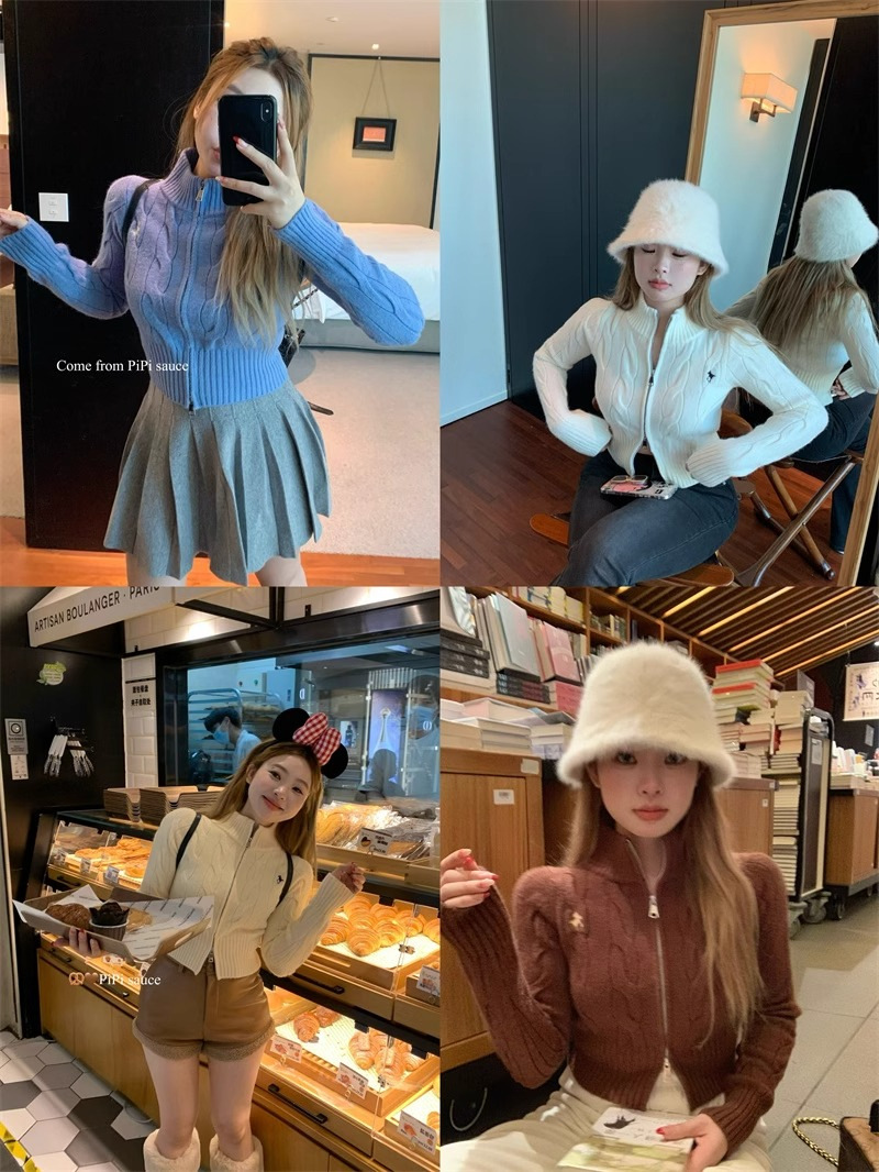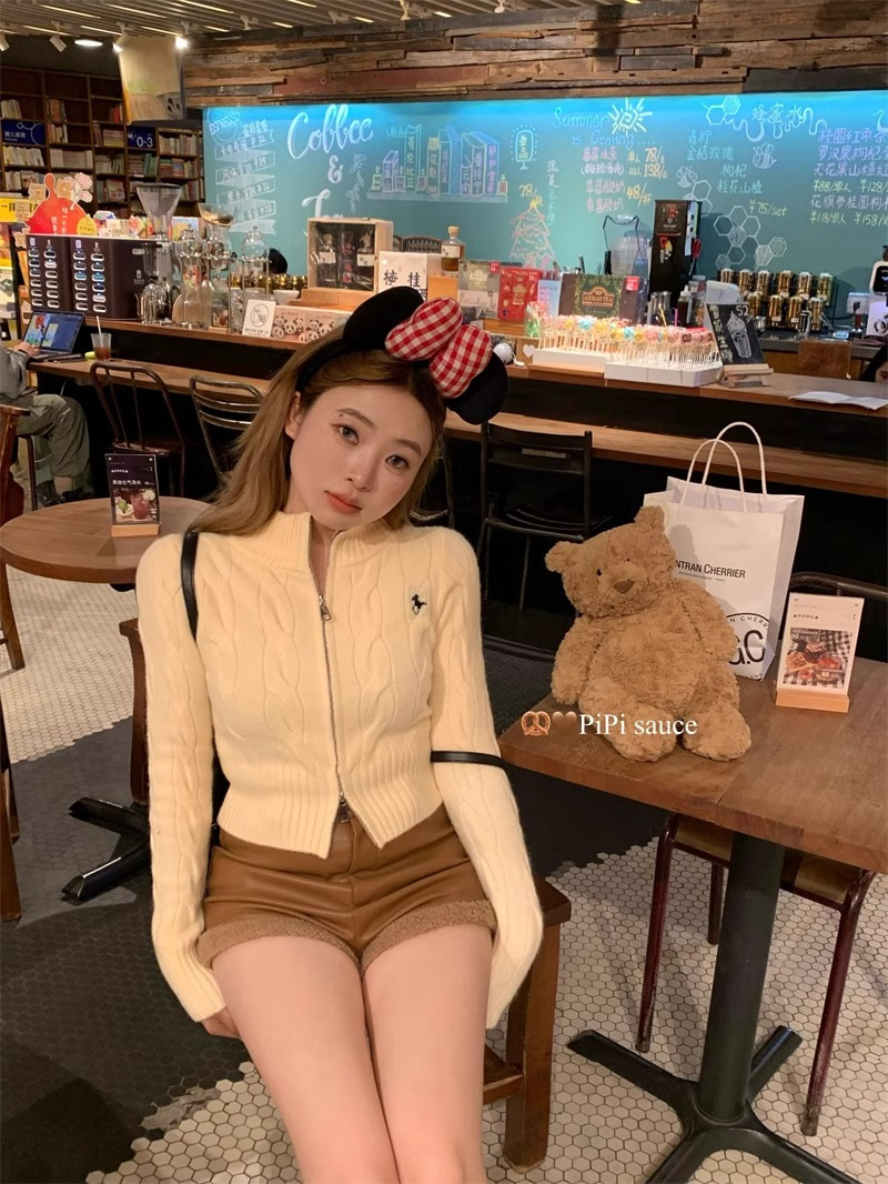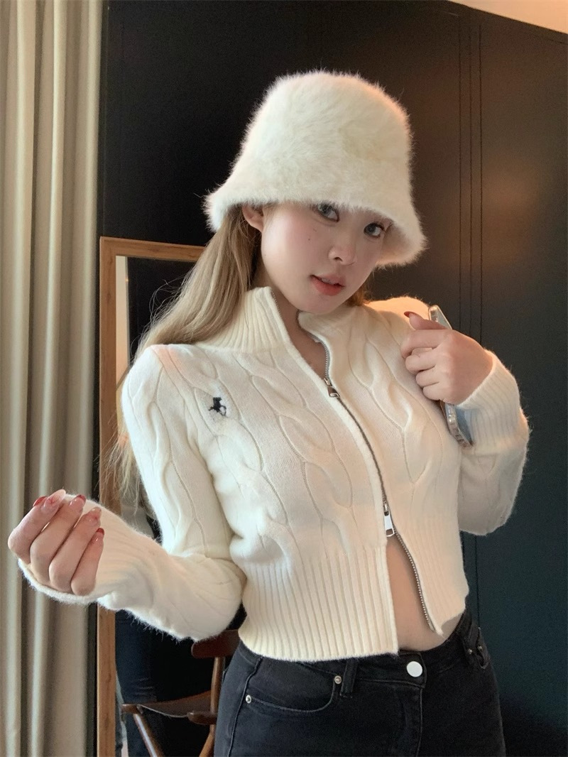 Главная страница > Свитер с вышивкой и воротником-стойкой, Женский Зимний вязаный кардиган с двойной молнией, белый тонкий короткий топ с длинными рукавами