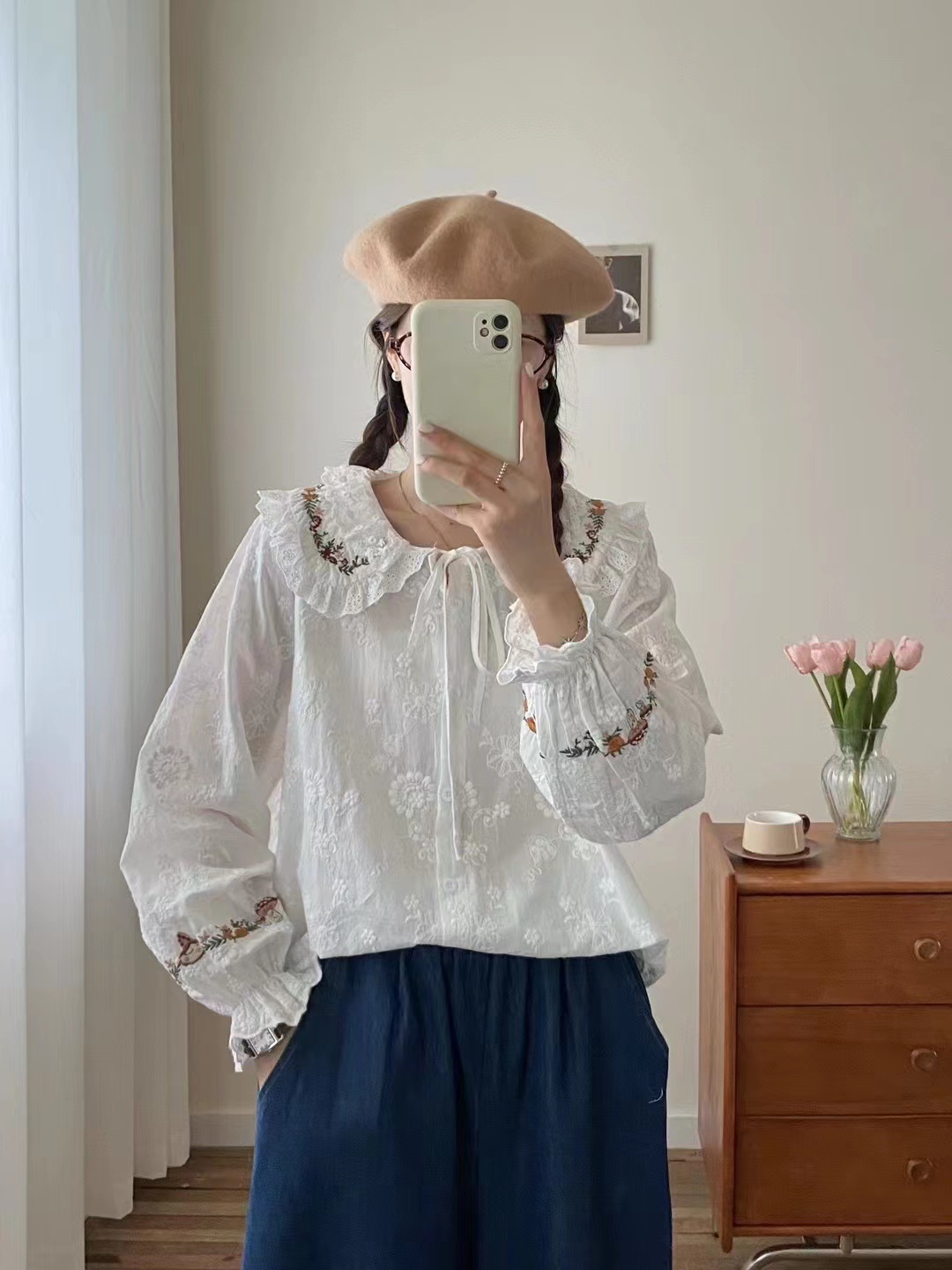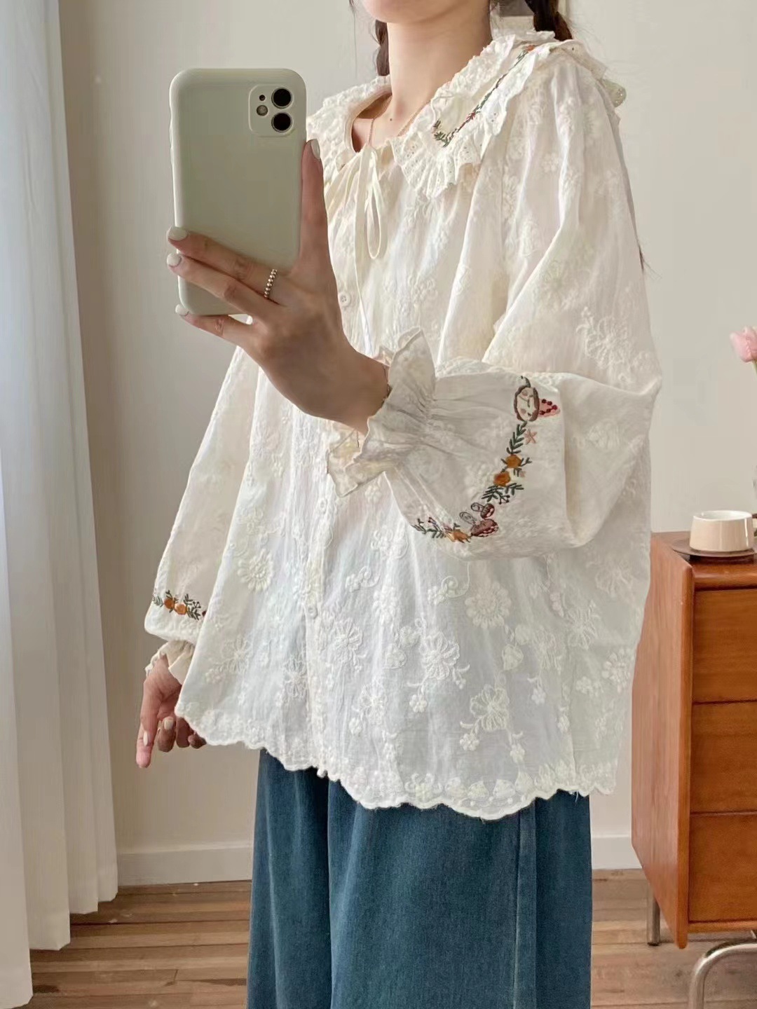 Главная страница > Японская вышивка Мори с детским воротником, хлопчатобумажная рубашка, женская осенняя новая свободная, дикая уменьшающая возраст, свежий топ
