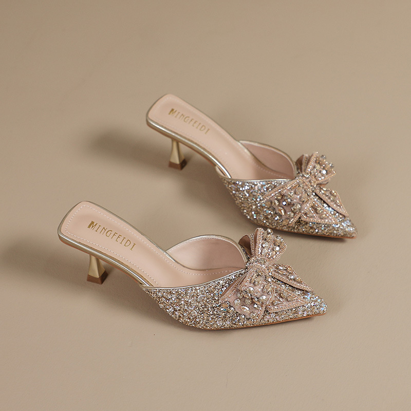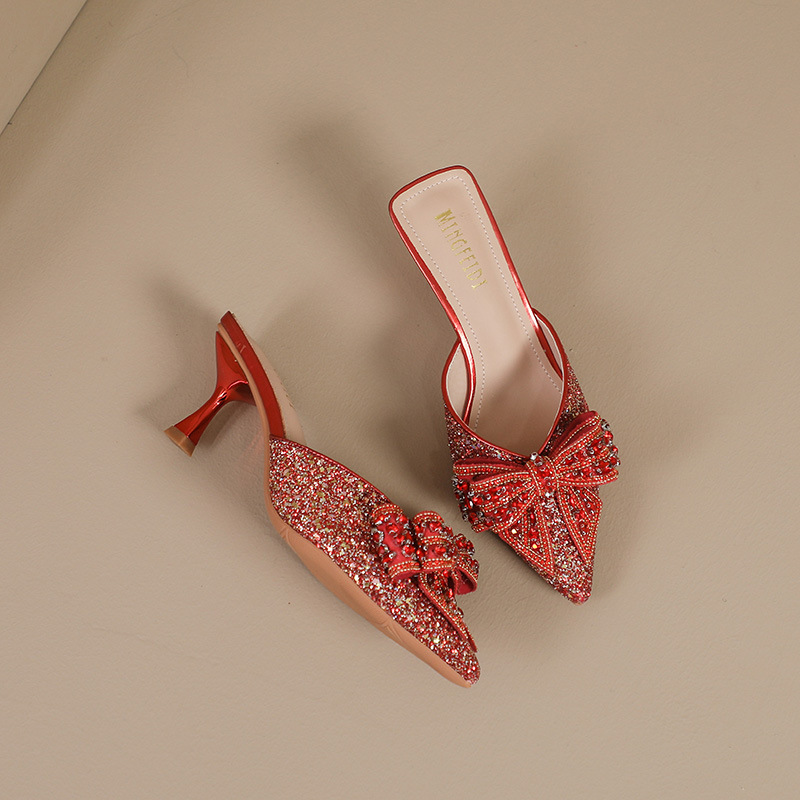 Стразы банты с головкой половинной тапочкой женская летняя одежда 2024 новые заостренные каблуки на высоком каблуке темпераментные холодные тапочки