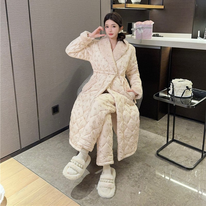 Женский зимний пижамный комплект: теплый, однотонный, трехслойный, стеганый, на флисовой подкладке, в китайском стиле, с длинными брюками и халатом, с узором «ромашка»