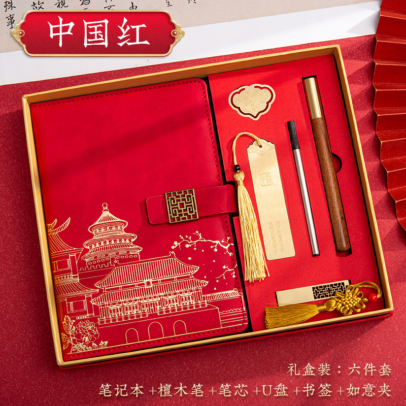 Китайский красный набор из шести предметов (книга + ручка + ручка + ручка + закладка + зажим Ruyi + U-диск)