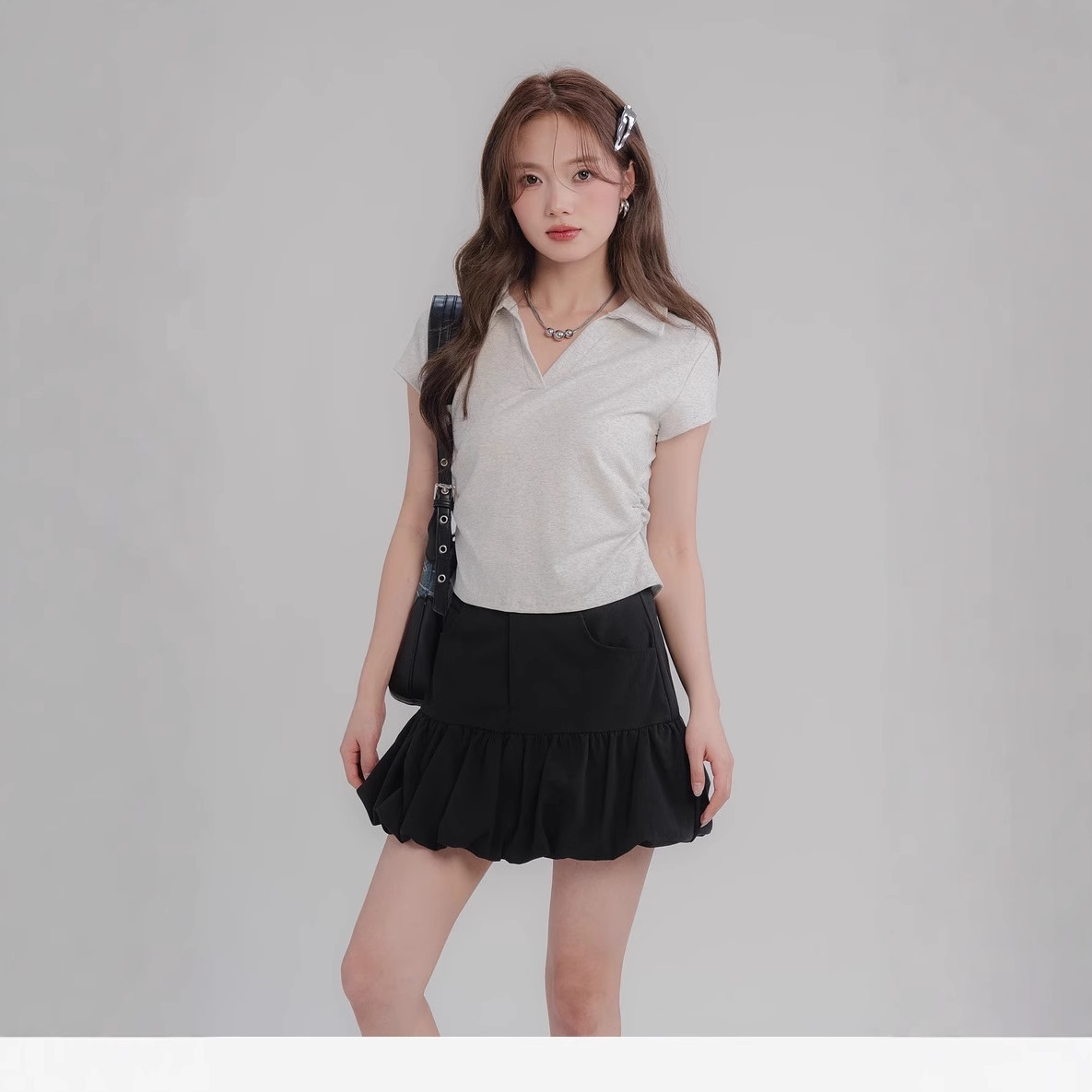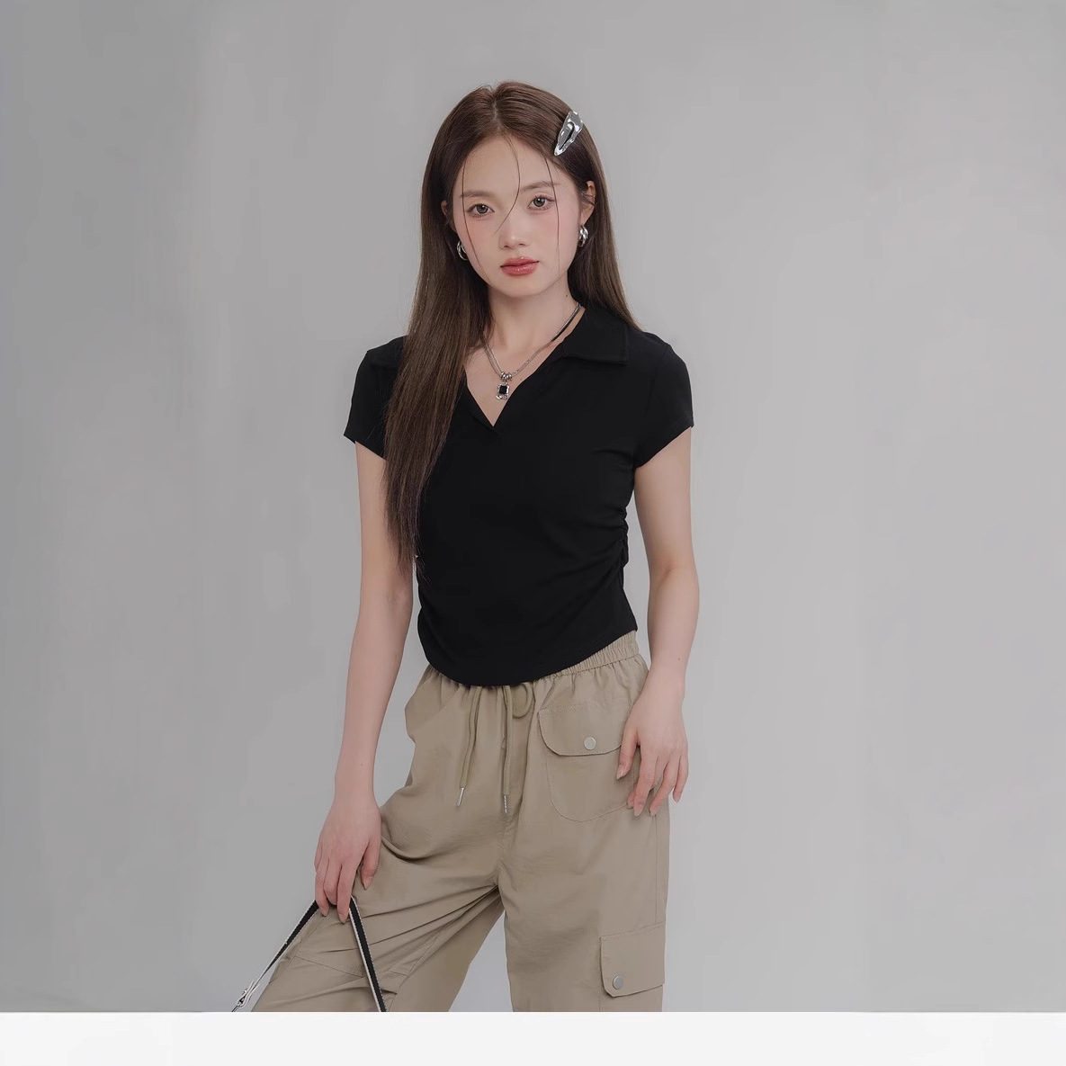 Главная страница > Летняя облегающая футболка с завышенной талией на правое плечо, женская футболка с короткими рукавами в американском стиле, сладкий и пряный короткий плиссированный топ с воротником-поло, модный