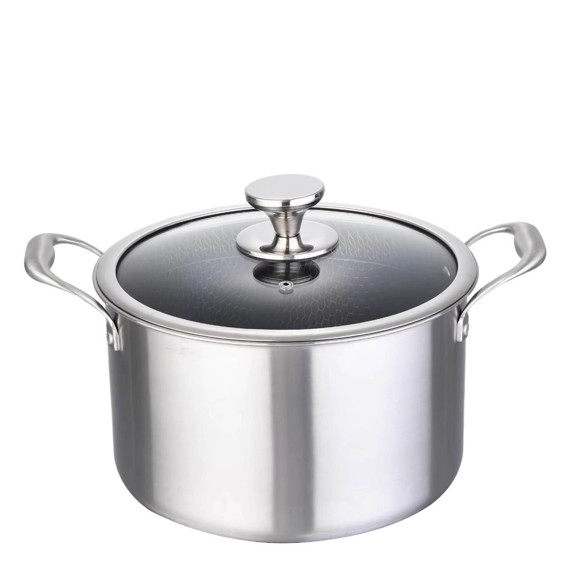 Главная страница > Поддерживает производство под собственной торговой маркой, трехслойная кастрюля для супа из нержавеющей стали 304 с двойной ручкой, универсальная для домашнего использования, подходит для приготовления на газовых и индукционных плитах.