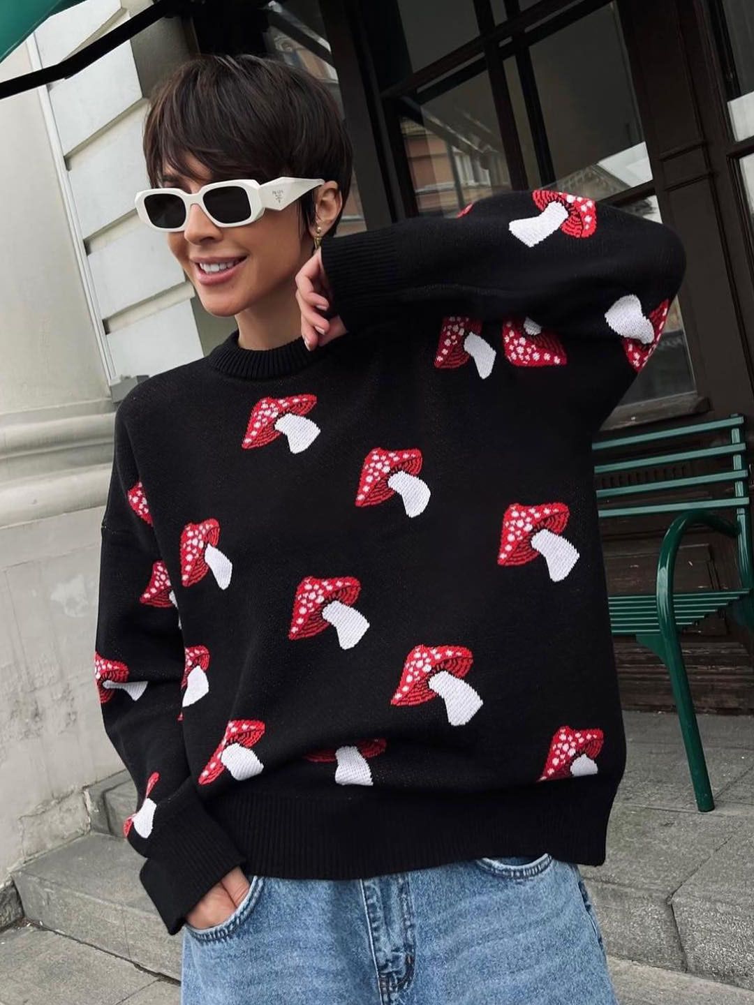 Главная страница > Свитер с принтом грибов для женщин, свободный крой, осенне-зимний повседневный стиль, трикотаж с длинными рукавами для женщин, европейский и американский стиль.