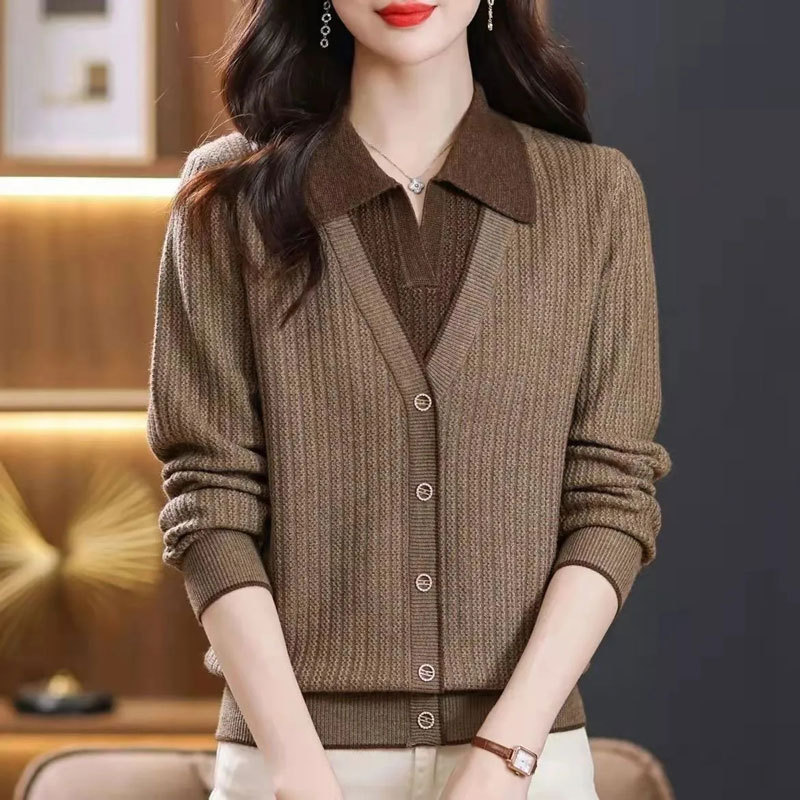 Главная страница > Hong 6079 осень и зима новый лацканный воротник поддельные два свитера вязаный свитер женский свободный внешний свитер