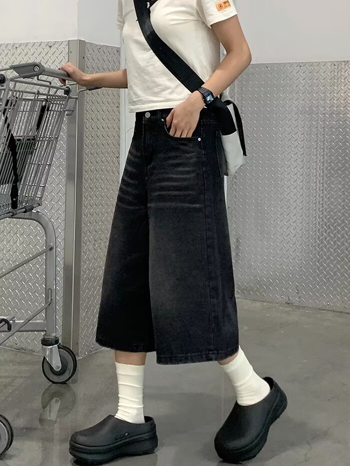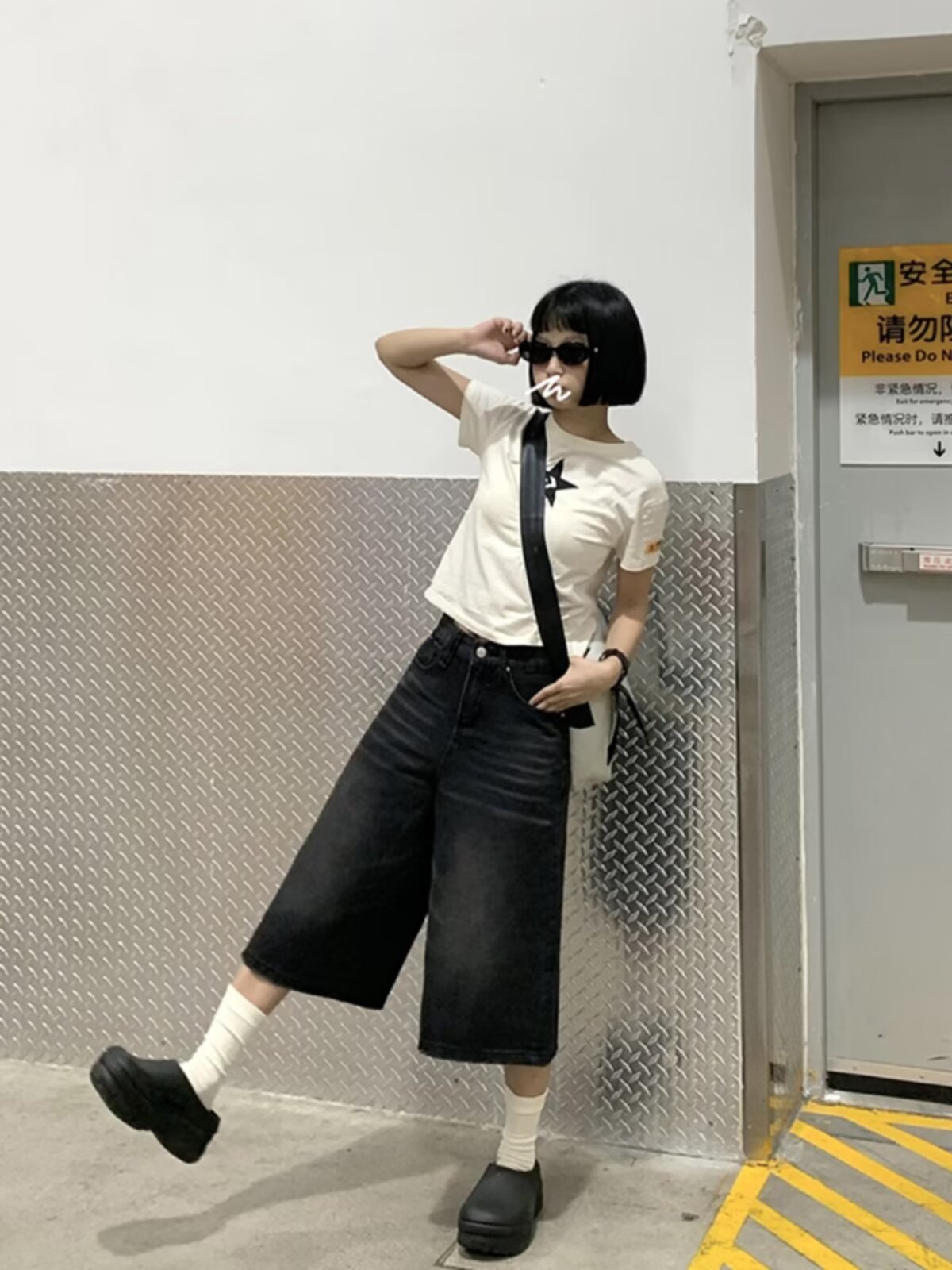 Главная страница > Укороченные широкие джинсы в американском стиле для женщин, новинка 2025 года, утягивающие свободные универсальные драпированные модные брюки средней длины с высокой талией, летние