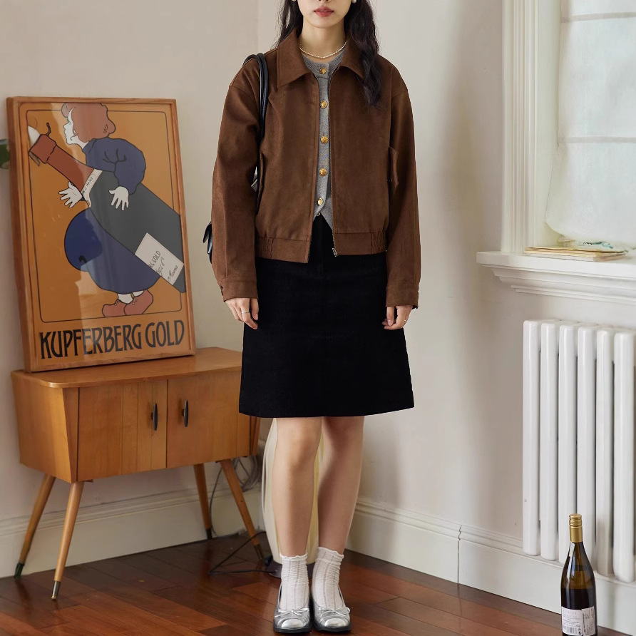 Главная страница > Женская короткая осенняя коричневая замшевая куртка в стиле ретро, маленькая свободная куртка на молнии с лацканами, предварительная продажа