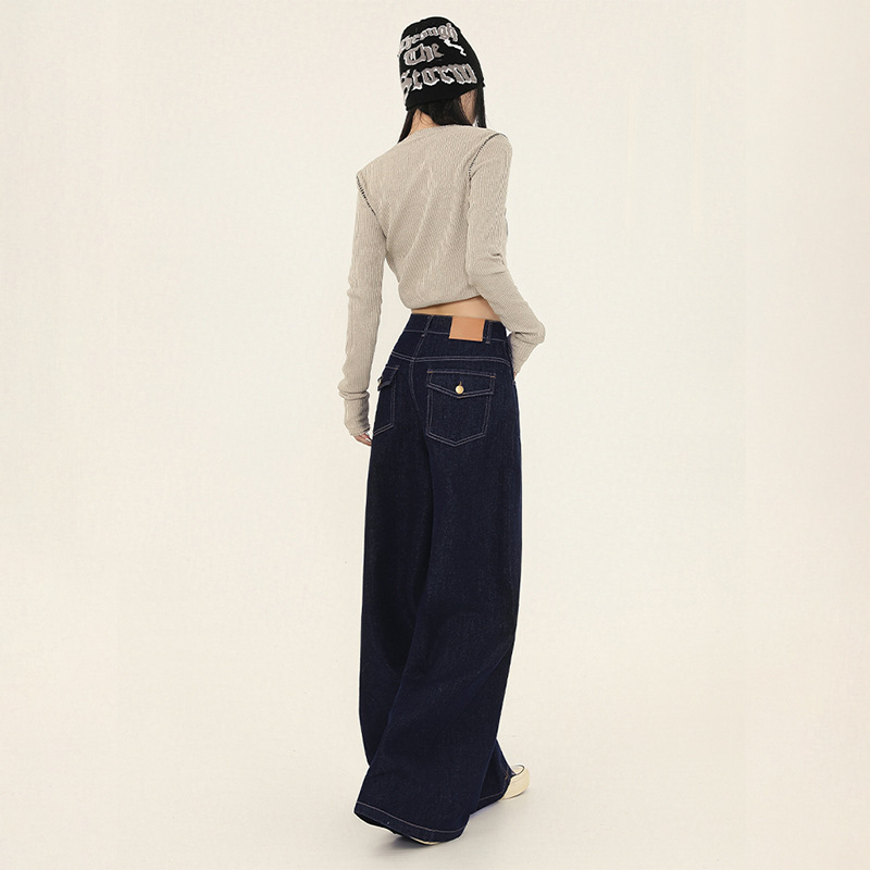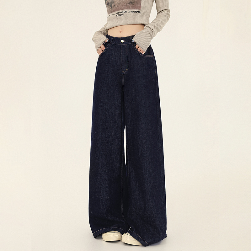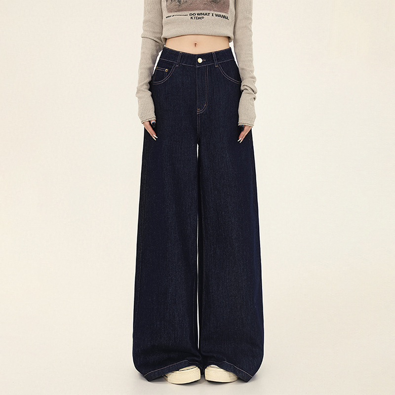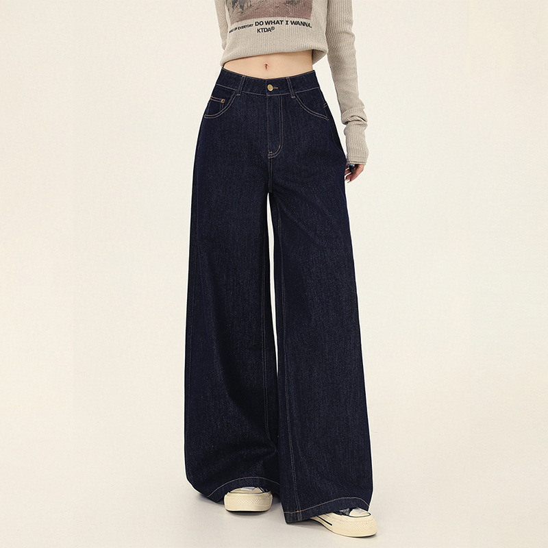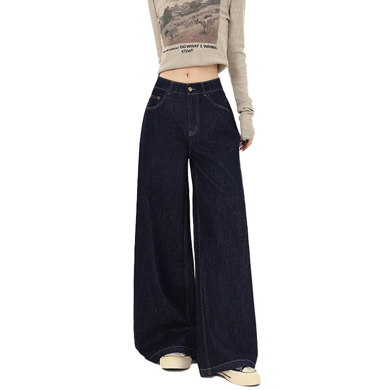 Главная страница > Темно-синие широкие джинсы для женщин, весна 2025, американский ретро-стиль, низкая талия, утягивающие, свободные, драпированные, в пол.