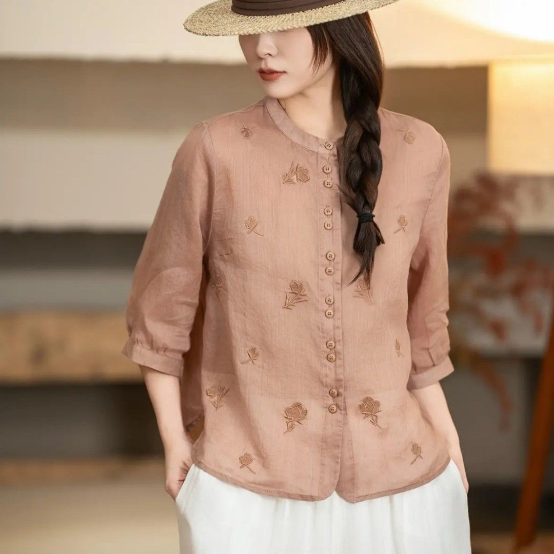 Главная страница > Воротник ретро свободная мода вышивка рубашка женская 2025 корейская версия минус возраст иностранца лето новая рубашка с рукавом из семи частей