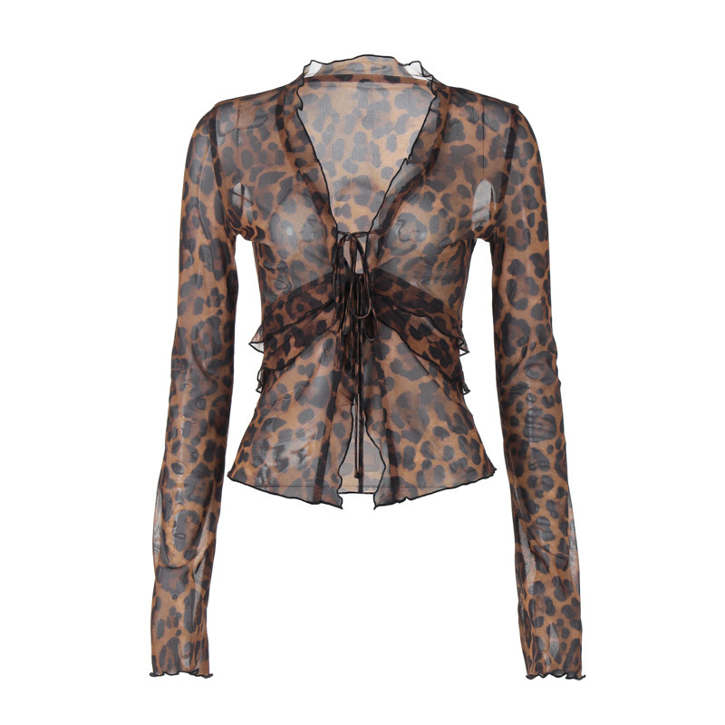 Главная страница > Сексуальный сексуальный топ с леопардовым принтом в европейском и американском стиле, лето 2021, женская новая модная сексуальная сетчатая прозрачная футболка на шнуровке