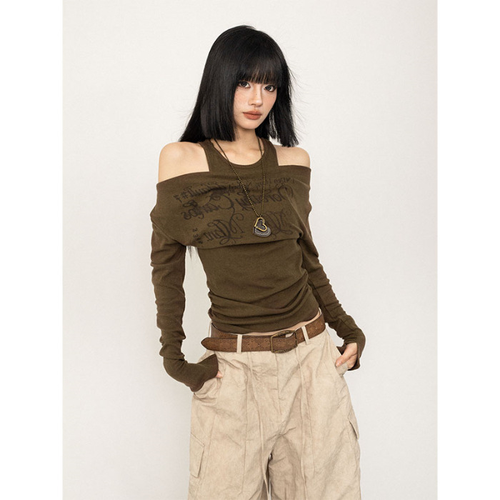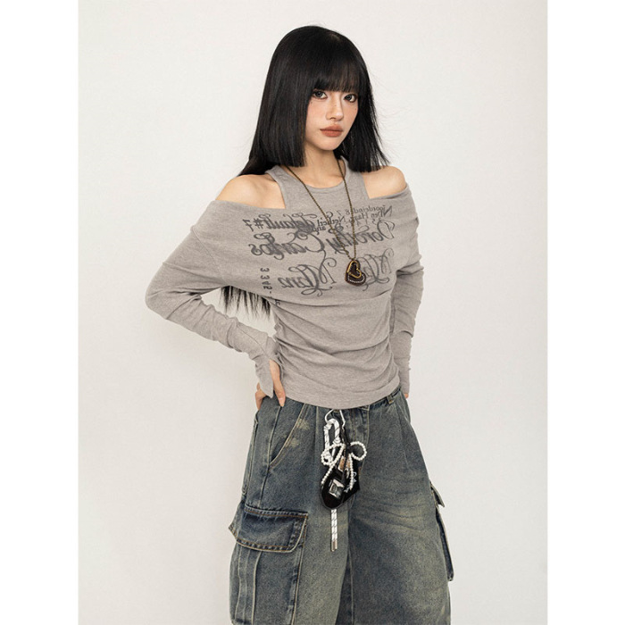 Главная страница > Популярная женская футболка с длинными рукавами и открытыми плечами в американском стиле ретро, модный короткий топ на одно плечо с защемленной талией