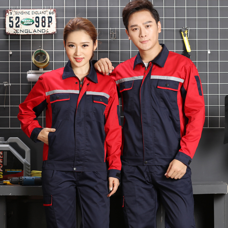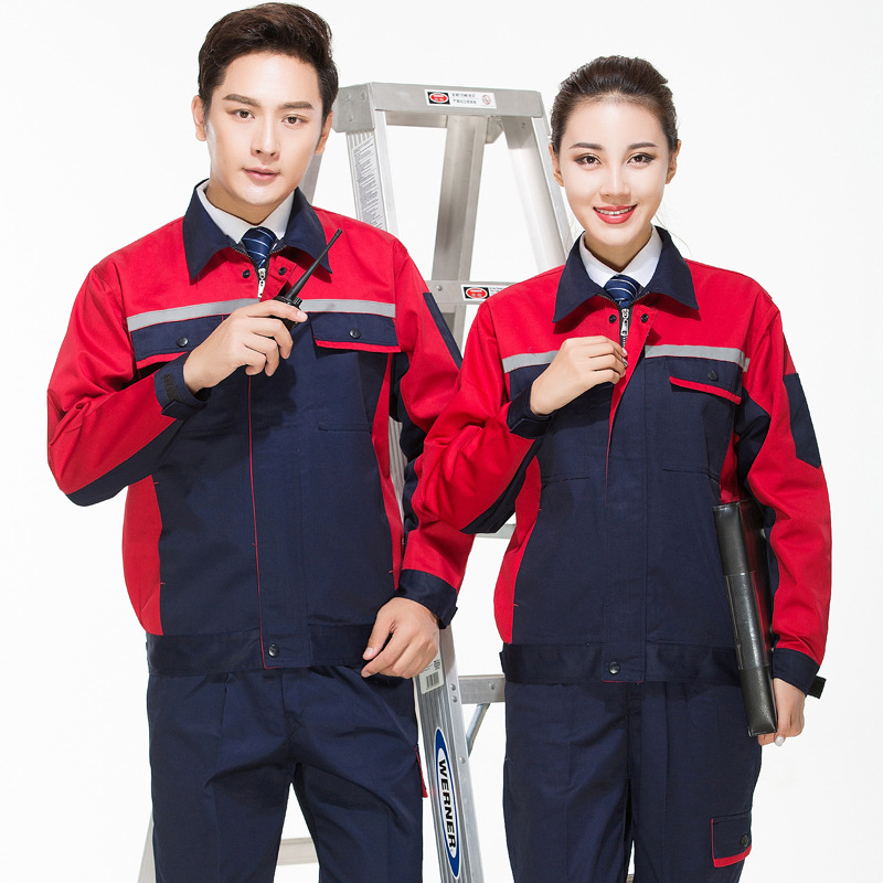 Рабочая одежда весенне-осенняя с длинными рукавами четвертого поколения красного и темно-синего цвета.