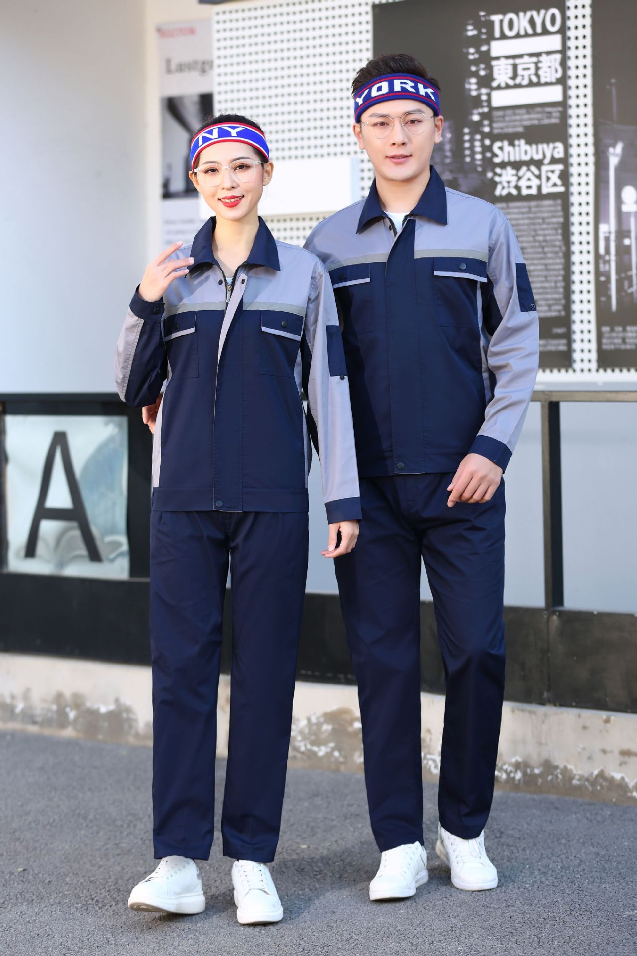 Рабочая одежда весенне-осенняя с длинными рукавами четвертого поколения темно-синего и серого цвета.