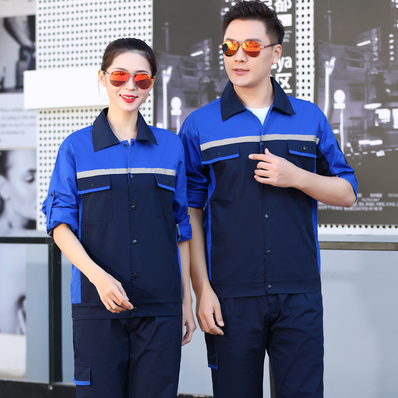 Рабочая одежда весенне-осенняя с длинными рукавами четвертого поколения ярко-синего и серого цветов.