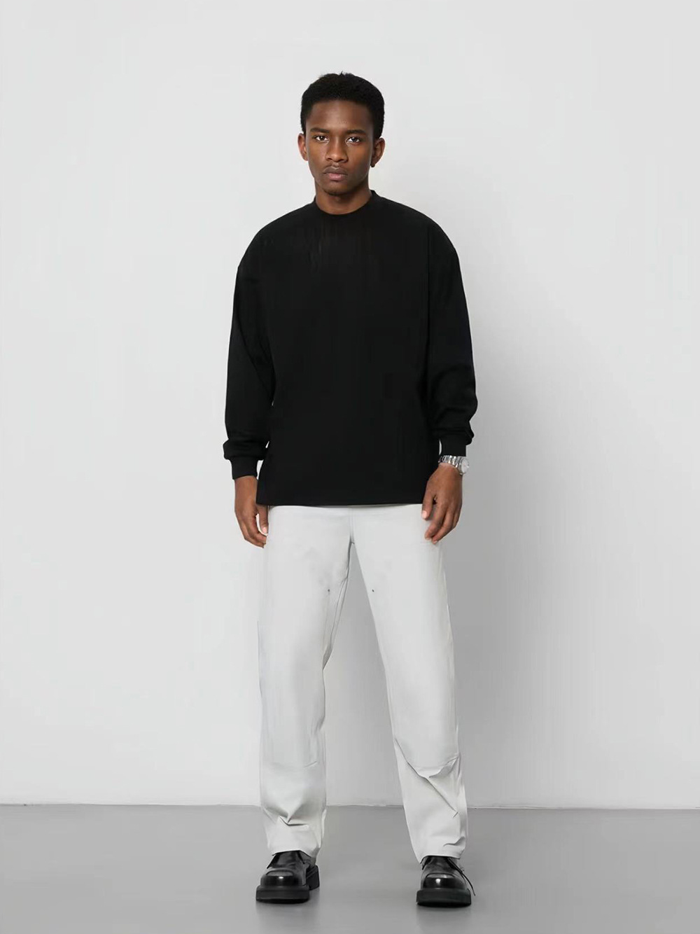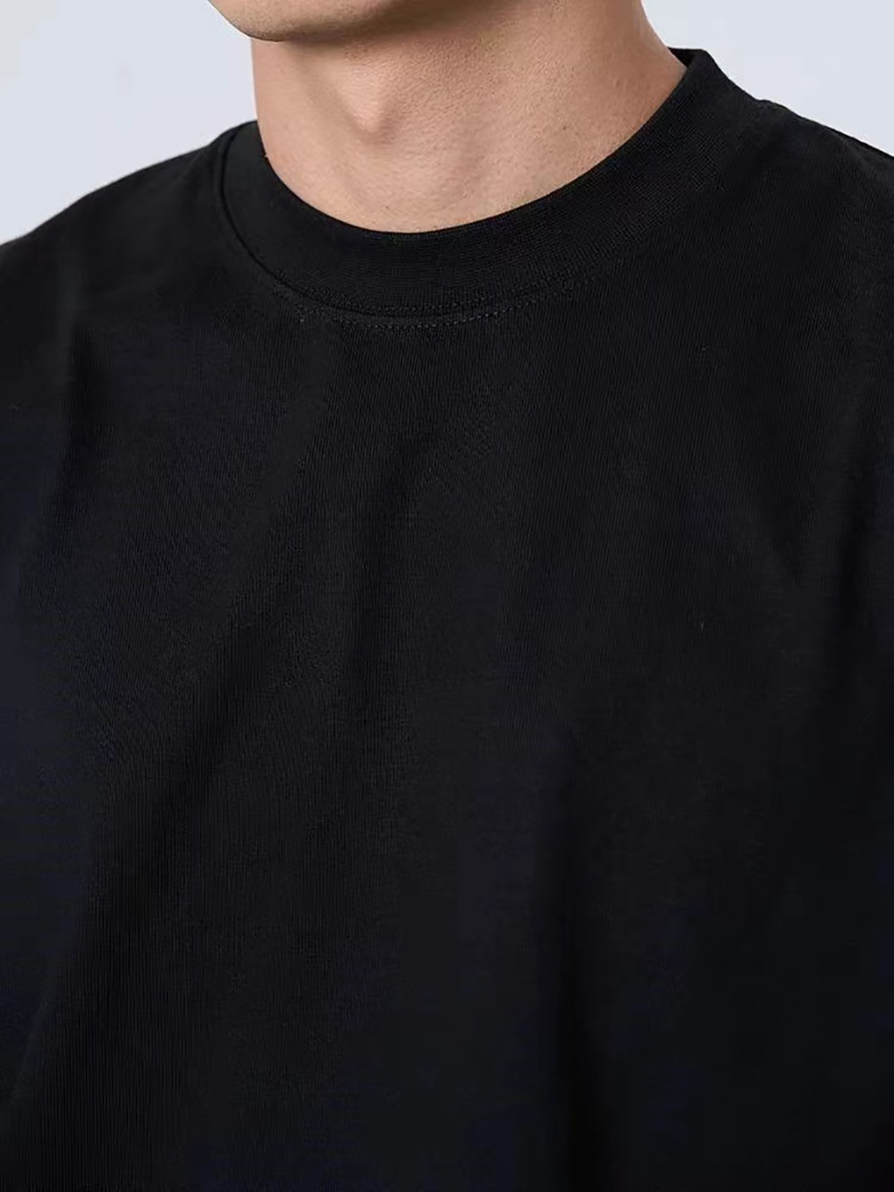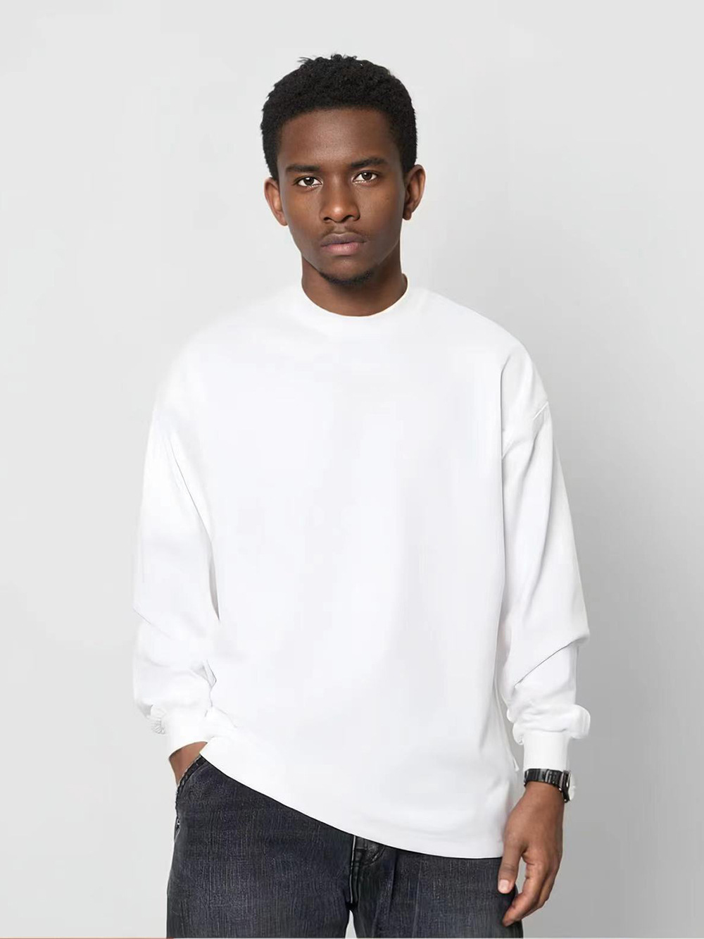 Главная страница > 350 г тяжелый прилив маленький вырез сплошной цвет футболка с длинными рукавами мужские высокие воротники свободные oversize европейские и американские футболки