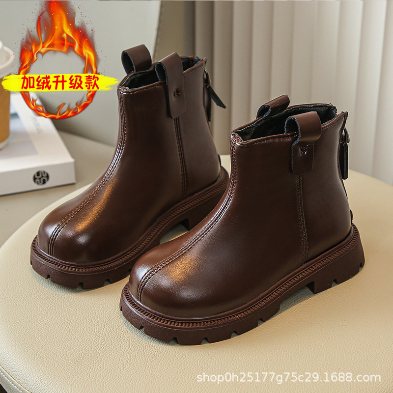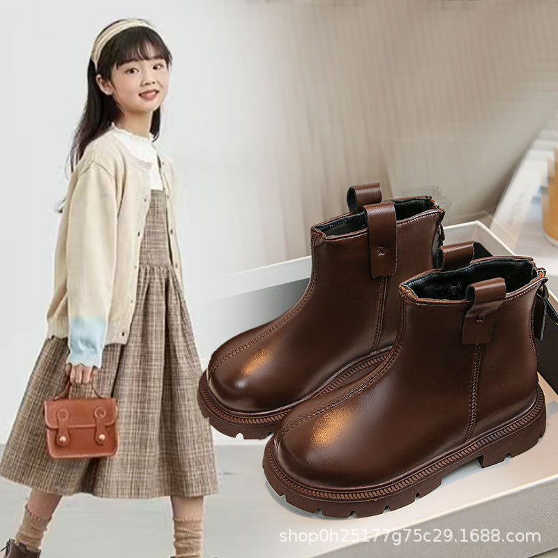 Кожаные сапоги для девочек, осень-зима 2024, новые детские короткие сапоги в корейском стиле для девочек, весенне-осенние одинарные сапоги для малышей, универсальные для дропшиппинга.