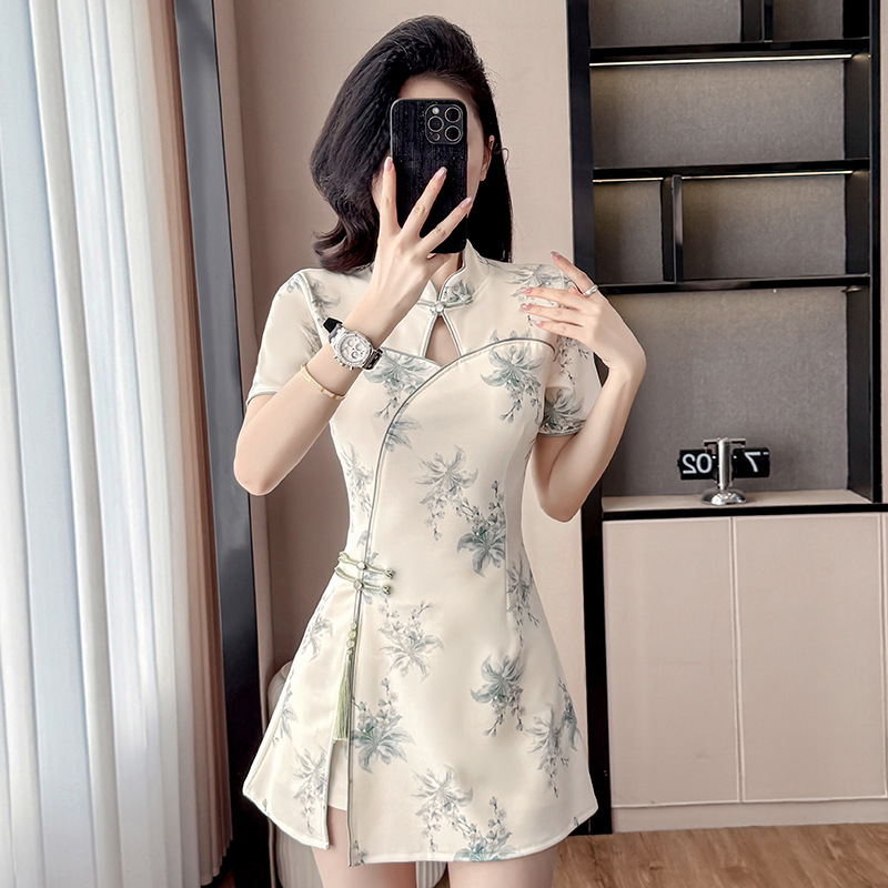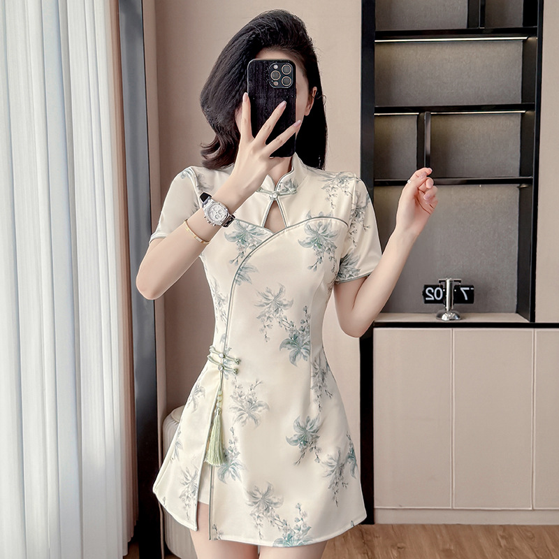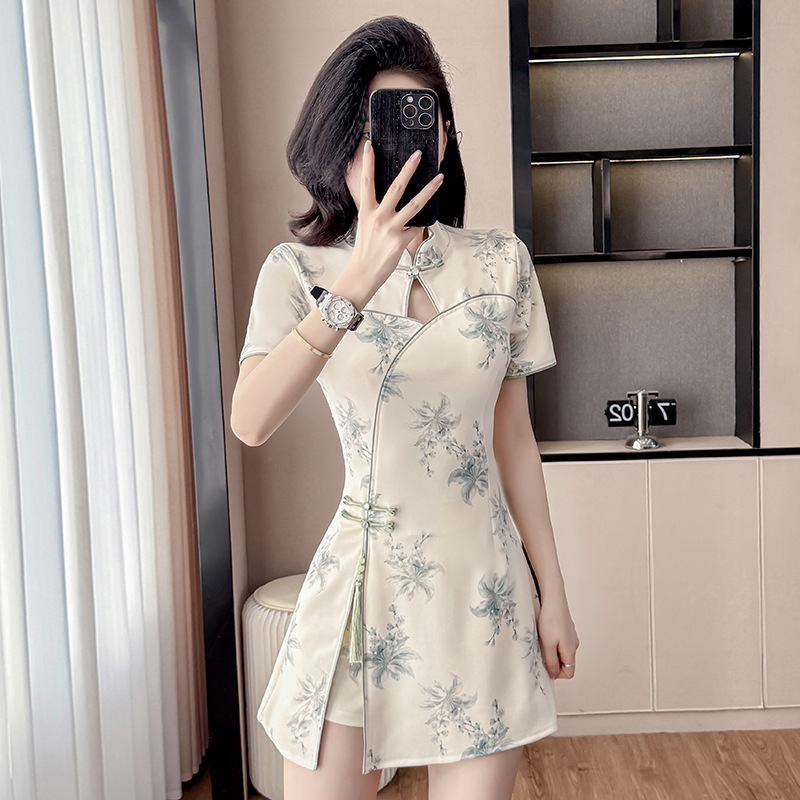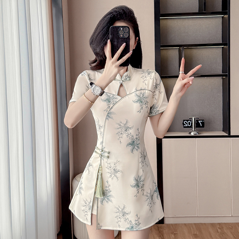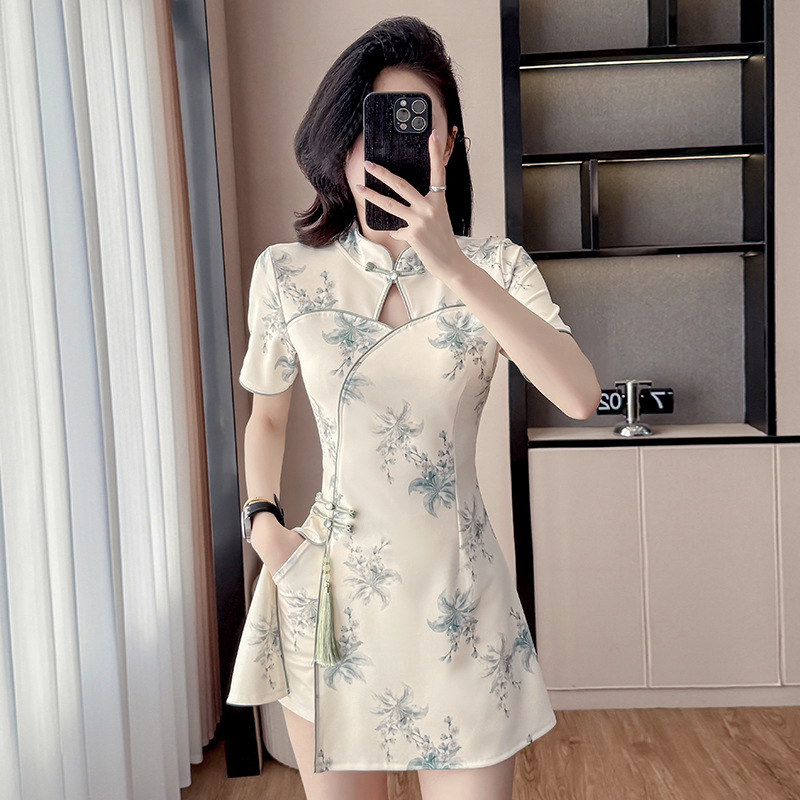 Фактический снимок улучшенного чонсама, нового стиля, нежного и молодого стиля, миниатюрного костюма для девочек, комплекта из двух предметов с цветами.