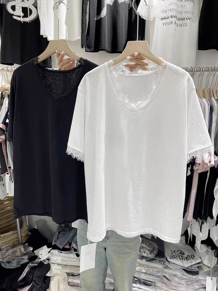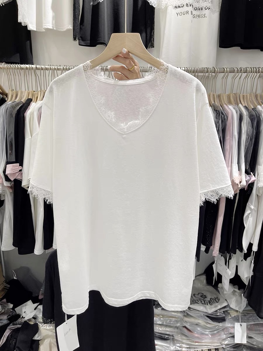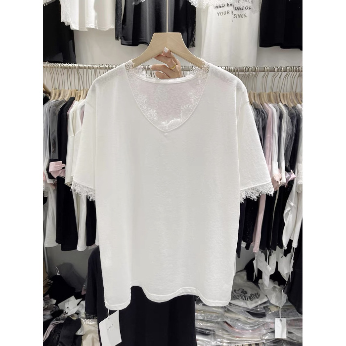 Главная страница > б659 # (Официальная цена) Очень большой размер, новинка 150kg года, свободная футболка с v-образным вырезом и кружевом, женские топы с короткими рукавами
