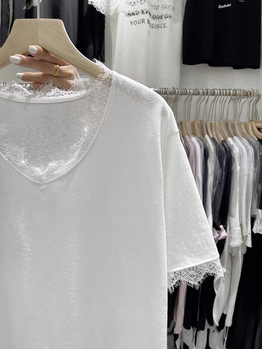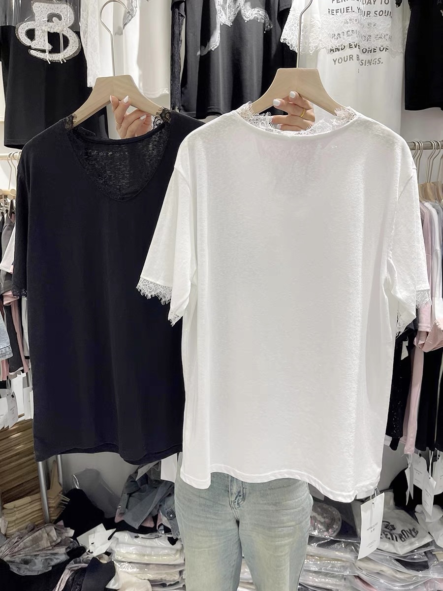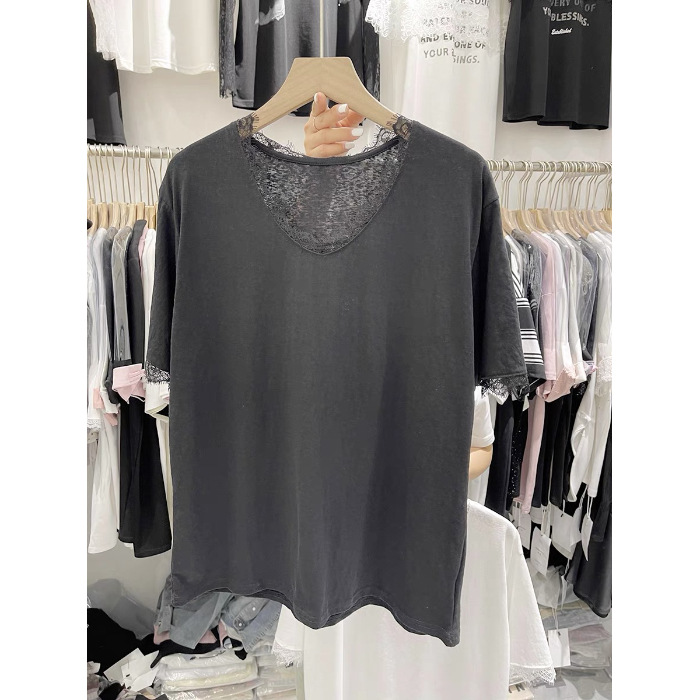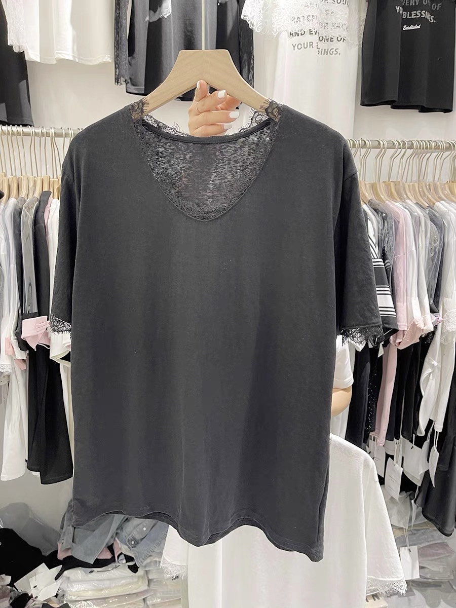 Главная страница > б659 # (Официальная цена) Очень большой размер, новинка 150kg года, свободная футболка с v-образным вырезом и кружевом, женские топы с короткими рукавами
