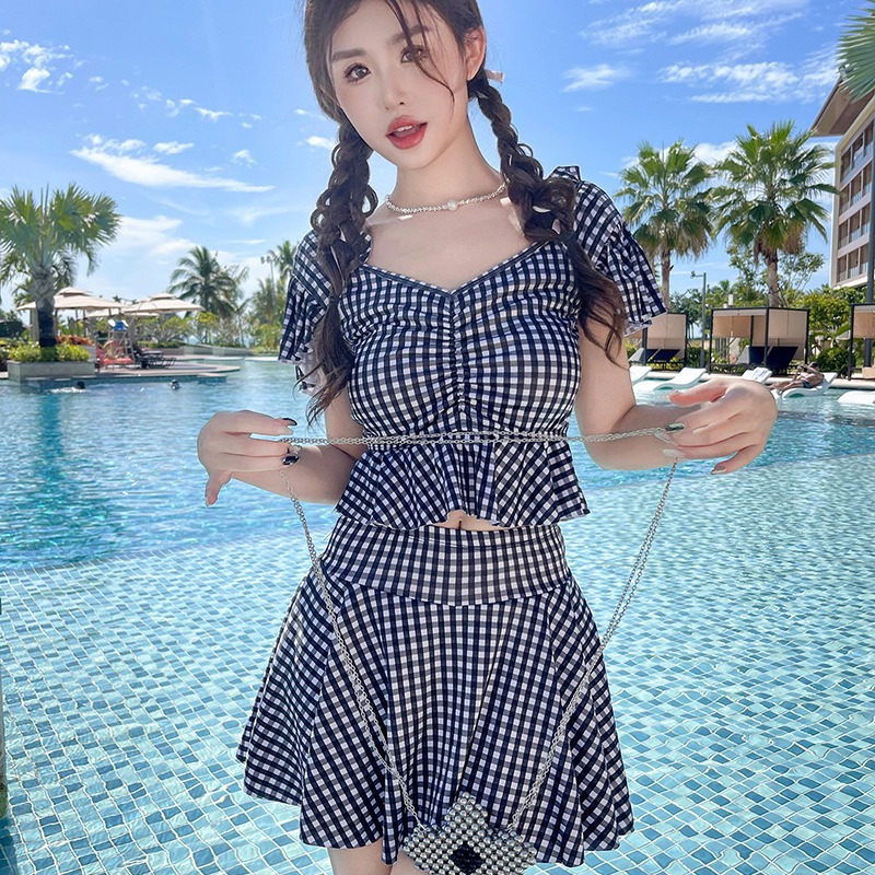 Главная страница > Новый женский купальник, модный купальник в стиле юбки с разрезом, женский купальник с короткими рукавами в клетку для девочек, милый купальник с рюшами для горячих источников