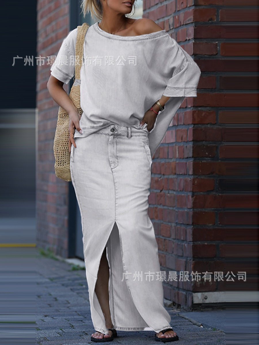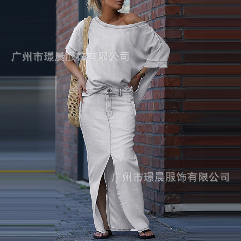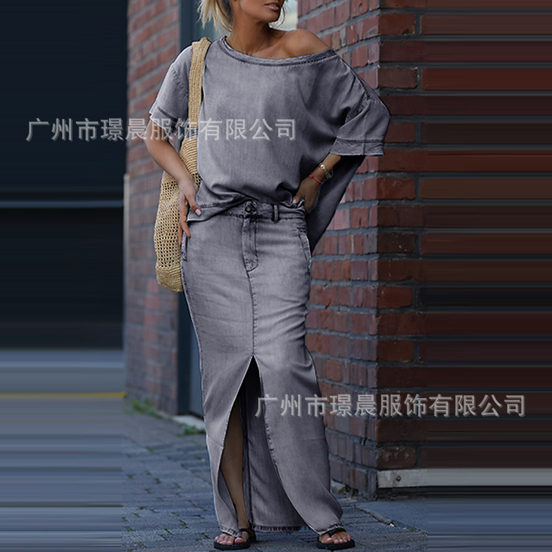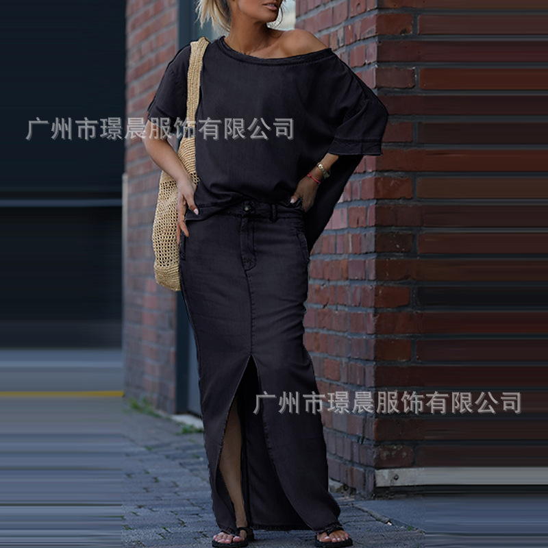Летний костюм из двух предметов для женщин, экспортируемый из Европы и Америки на Amazon в 2025 году: топ и юбка с разрезом.
