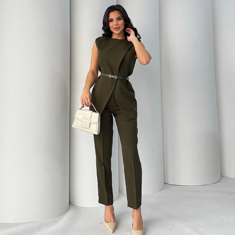 Главная страница > 2024 лето новый европейский и американский Amazon трансграничный сплошной цвет круглый вырез без рукавов топ с высокой талией широкие брюки из двух частей женский набор