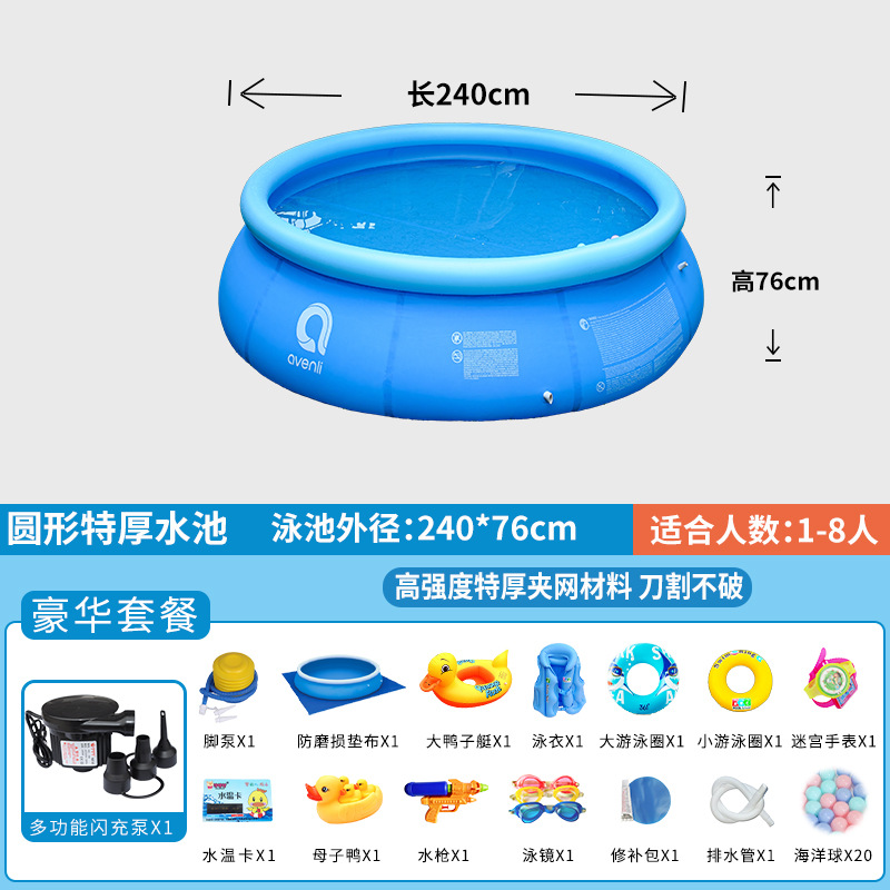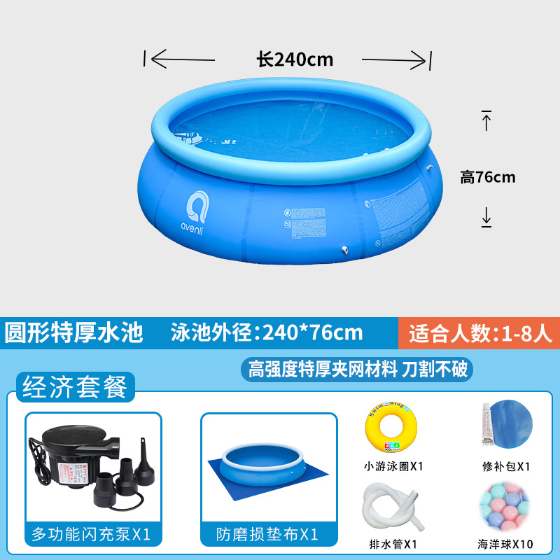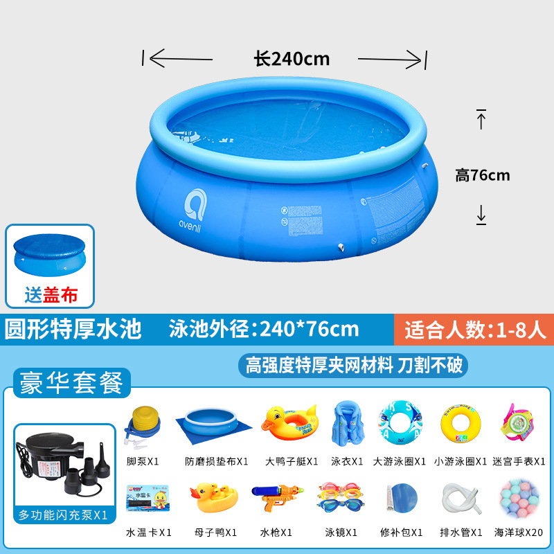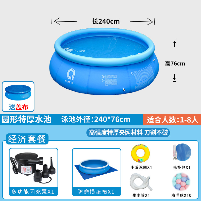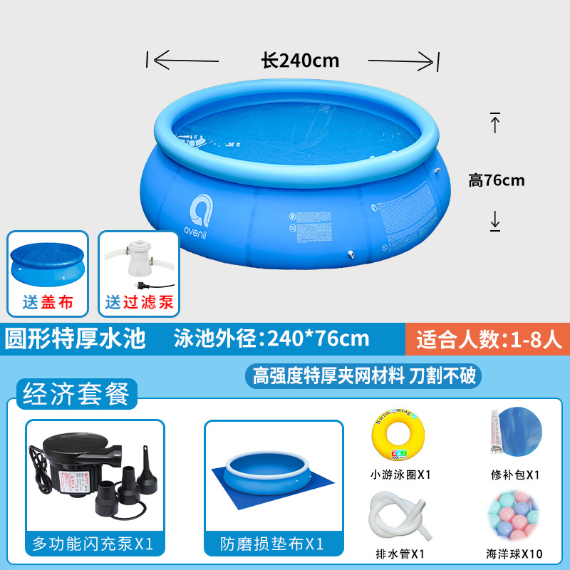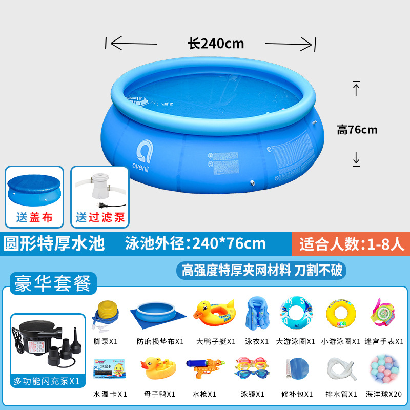 Очень толстый: диаметр 240 * высота 76 см, экономичная упаковка + чехол + фильтр-насос.