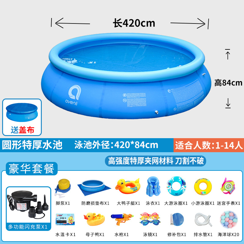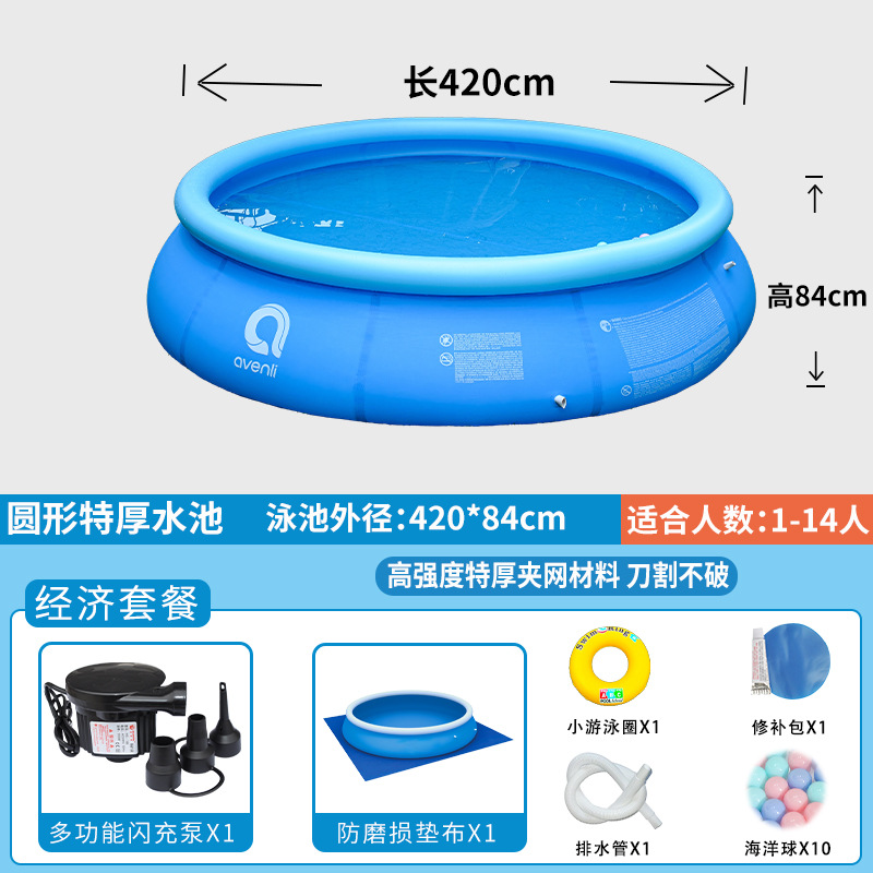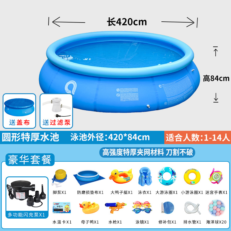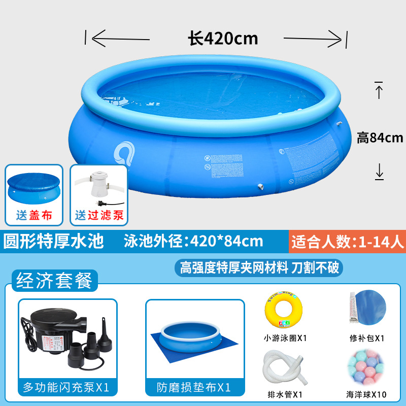 Очень толстый: диаметр 420 * высота 84 см, экономичная упаковка + чехол + фильтрующий насос.