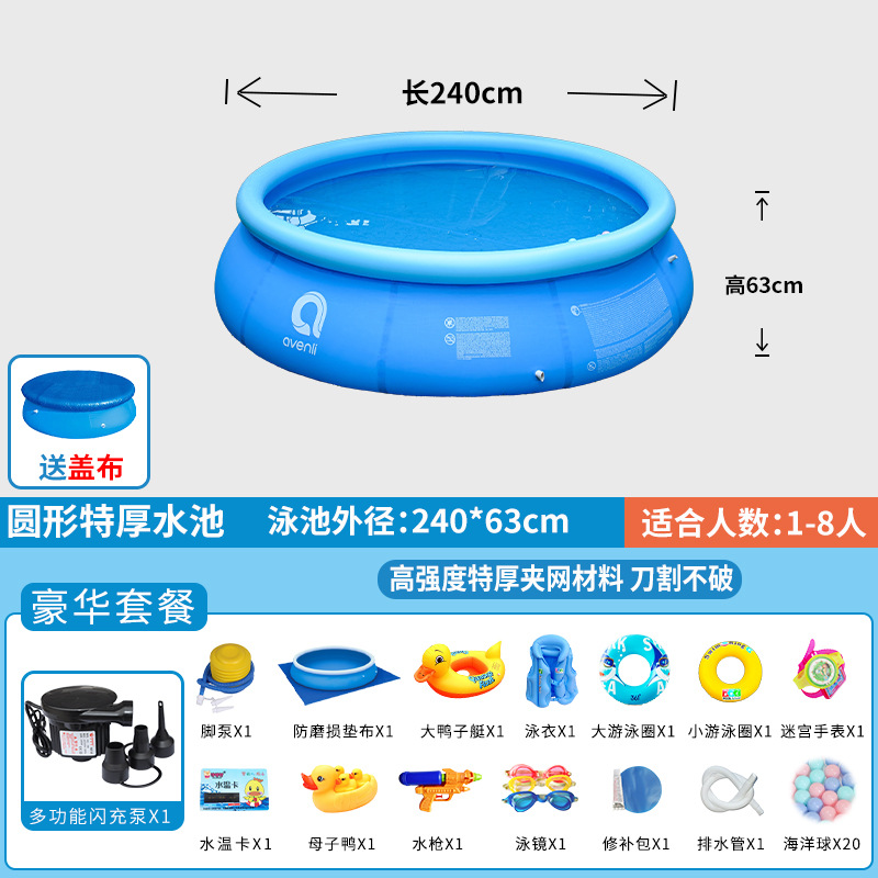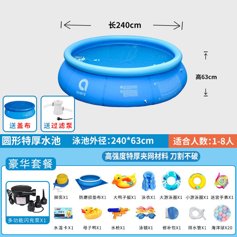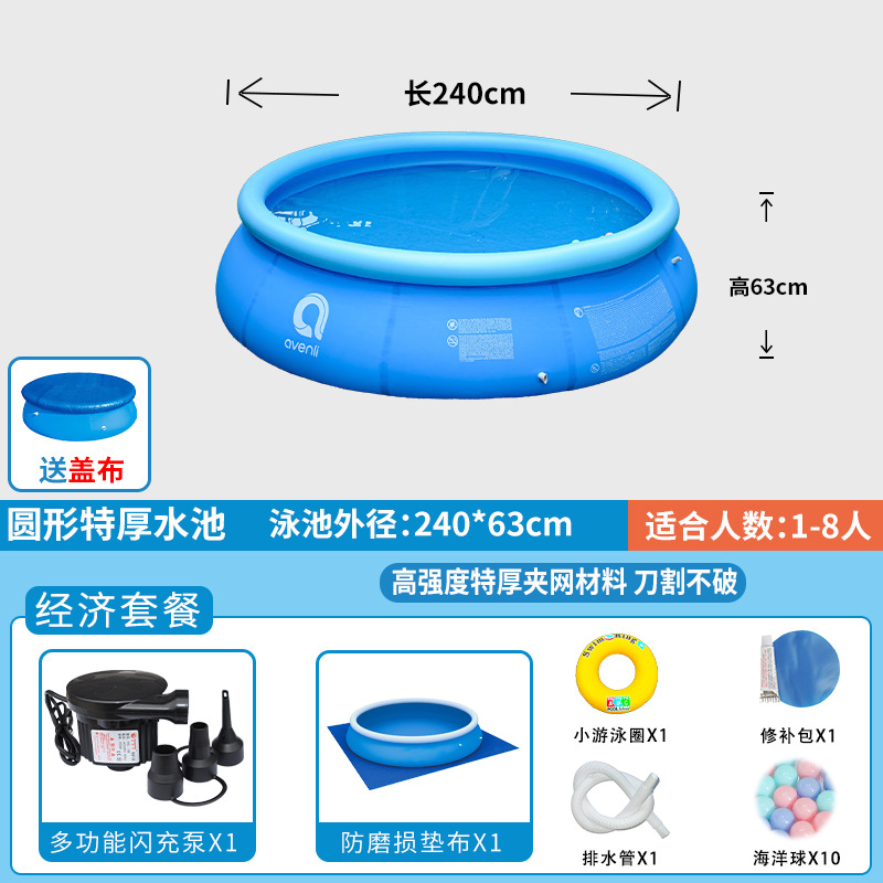 Очень толстый: диаметр 240 * высота 63 см, экономичная упаковка + чехол + фильтрующий насос.