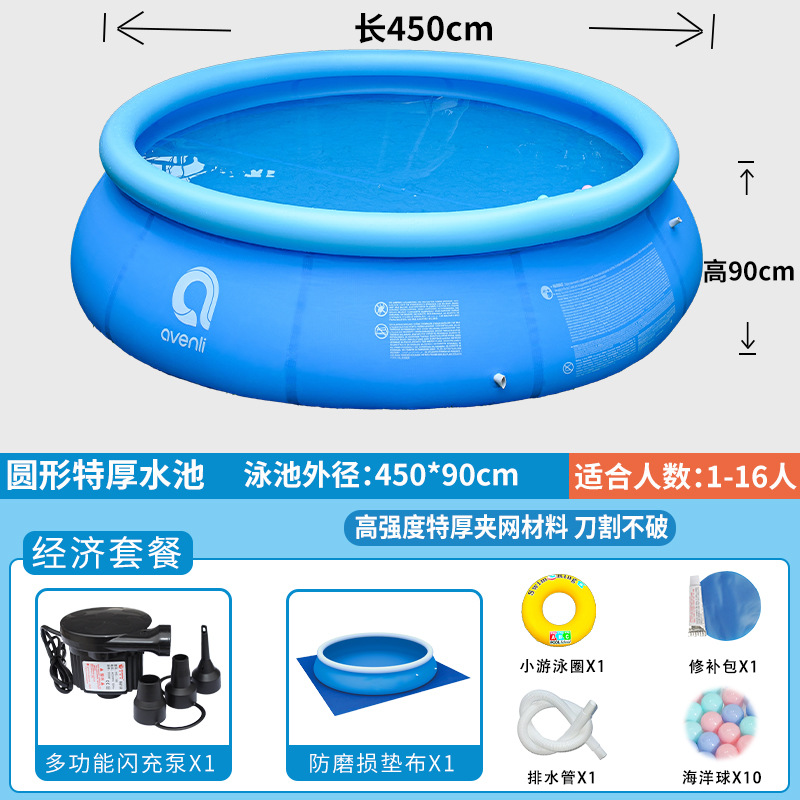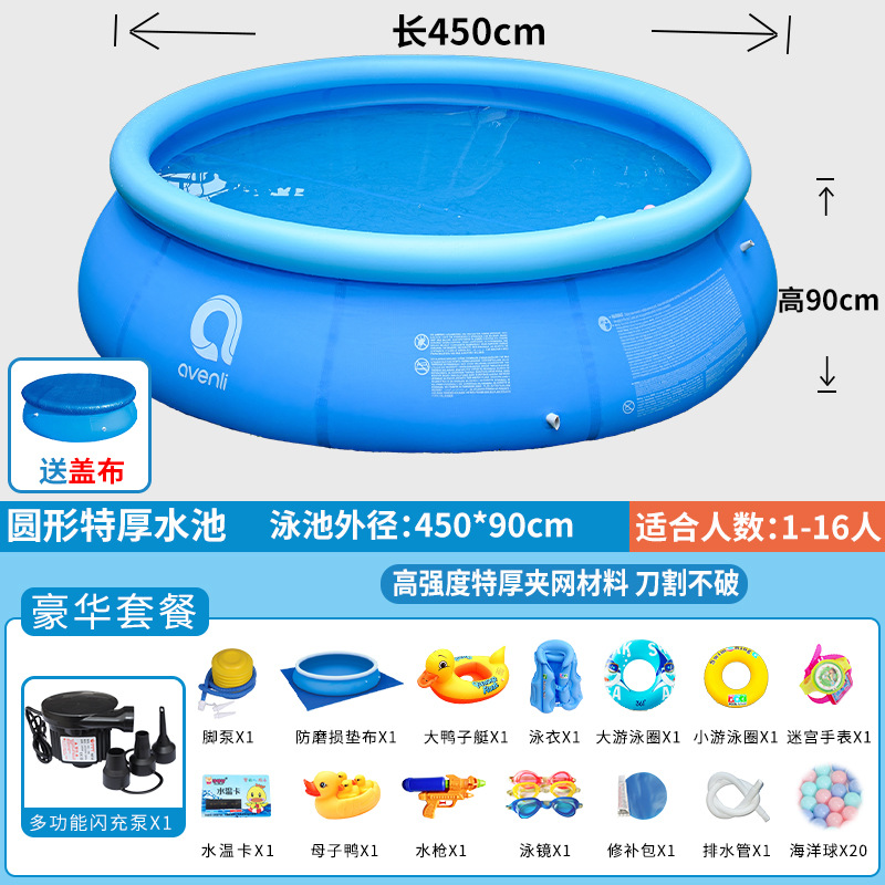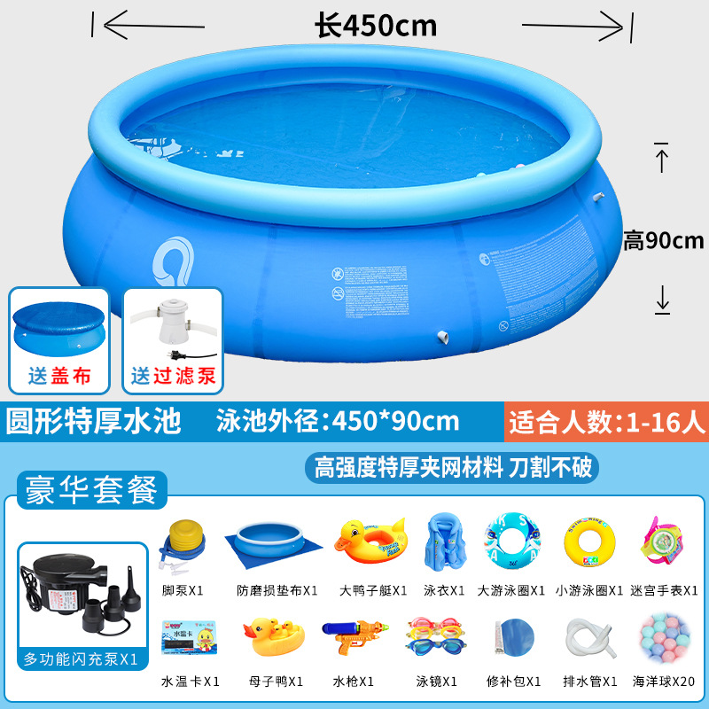 Очень толстый: диаметр 450 * высота 90 см, экономичная упаковка + чехол + фильтрующий насос.