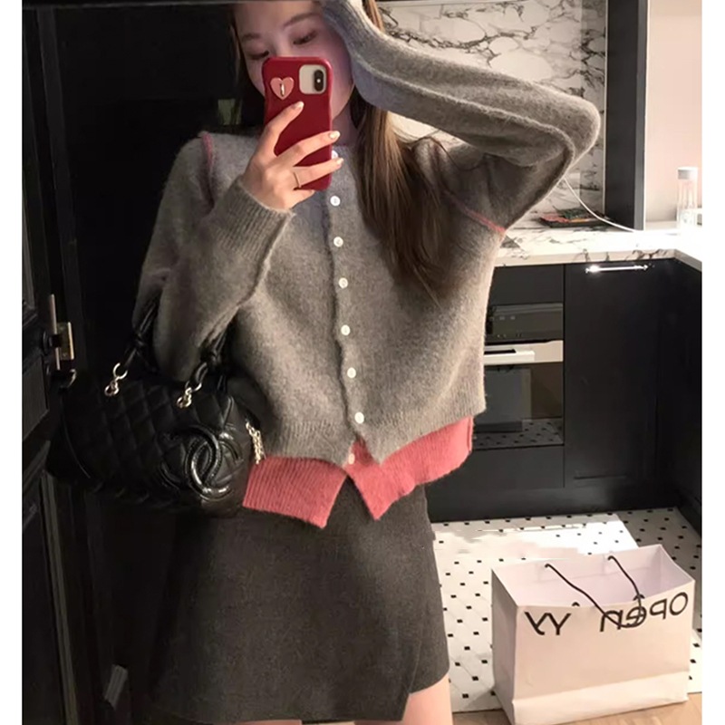 Главная страница > Мягкий и пушистый вязаный кардиган из двух частей с цветными блоками, новинка осени и зимы 2025 года, облегающий повседневный свитер с круглым вырезом, женская куртка.