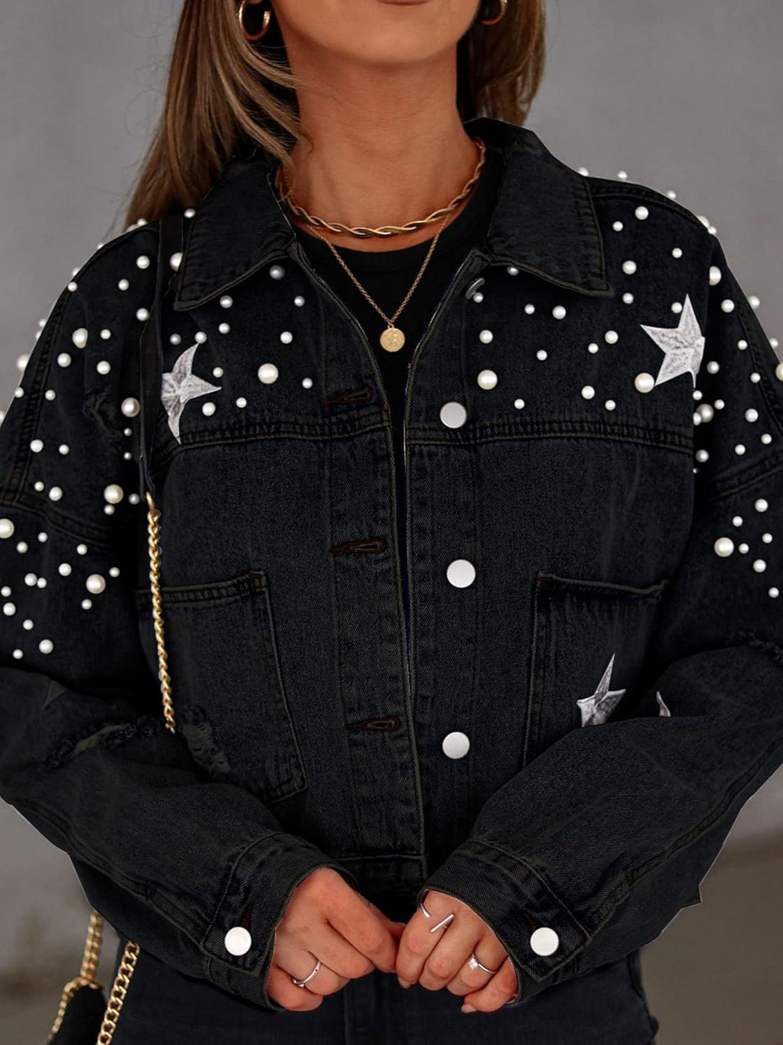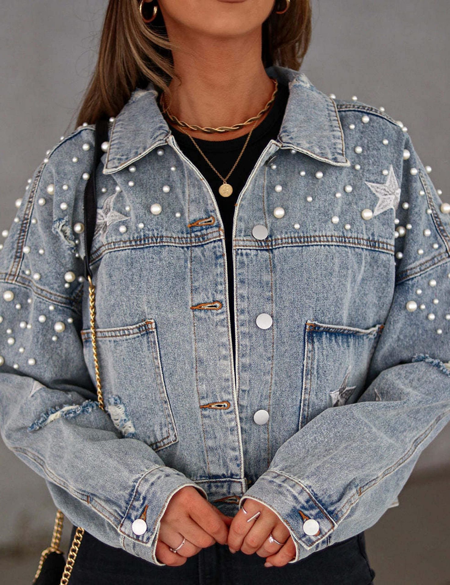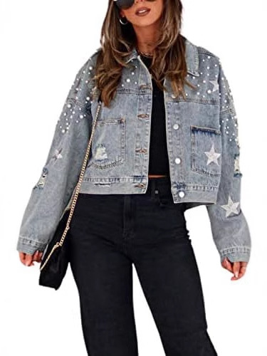 Главная страница > Трансграничная амазонка женская короткая жемчужная джинсовая куртка с бисером дырки звезды вышитая новая джинсовая куртка