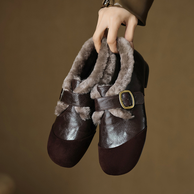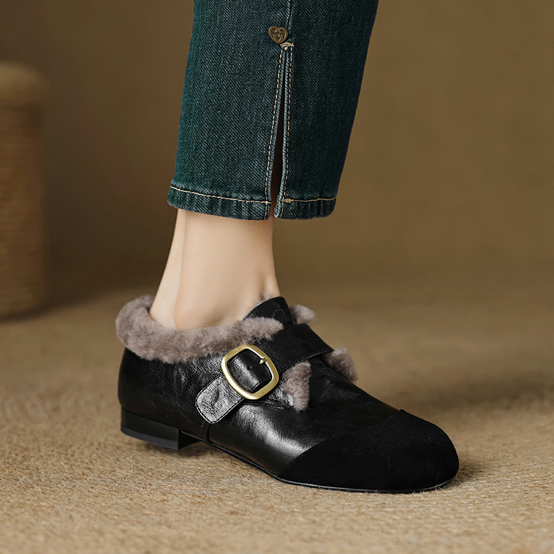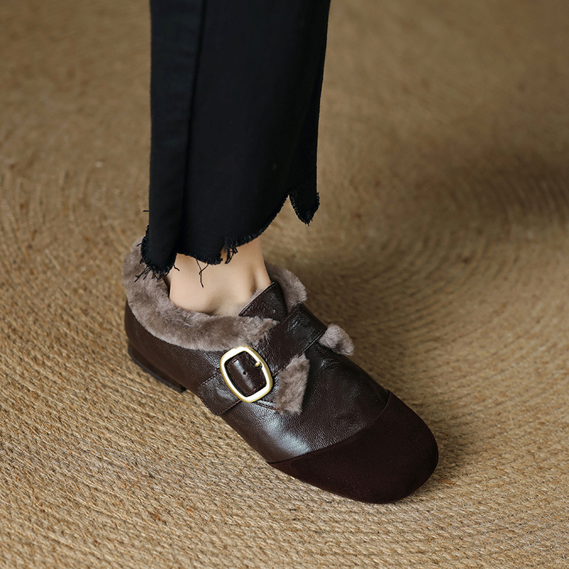 Овчинный песок сшивание плоского дна одиночные туфли женские педали повседневные туфли с глубоким ртом маленькие кожаные туфли плюс бархат теплые меховые туфли