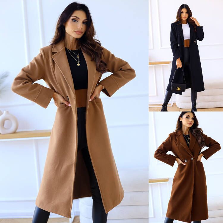 Главная страница > Международная торговля: Европейская и американская женская одежда, осенне-зимнее шерстяное пальто Amazon 2025 с двубортным застежением, длинными рукавами, отложным воротником и пуговицами.