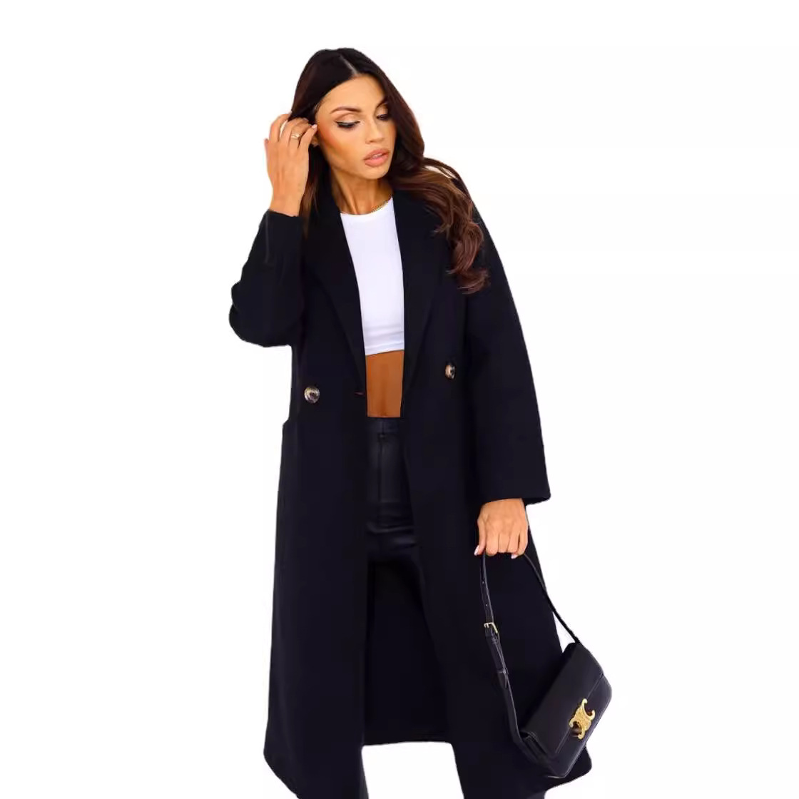 Международная торговля: Европейская и американская женская одежда, осенне-зимнее шерстяное пальто Amazon 2025 с двубортным застежением, длинными рукавами, отложным воротником и пуговицами.