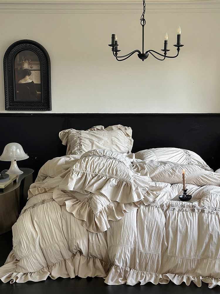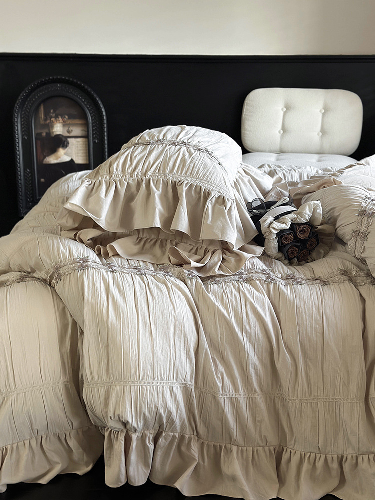 Комплект из четырех предметов из промытого хлопка из французского хлопка, Нежный кружевной комплект принцессы, хлопковая простыня для девочек, вышитое пододеяльник, постельное белье