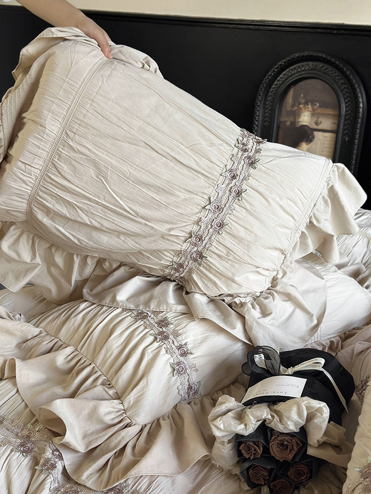 Главная страница > Комплект из четырех предметов из промытого хлопка из французского хлопка, Нежный кружевной комплект принцессы, хлопковая простыня для девочек, вышитое пододеяльник, постельное белье