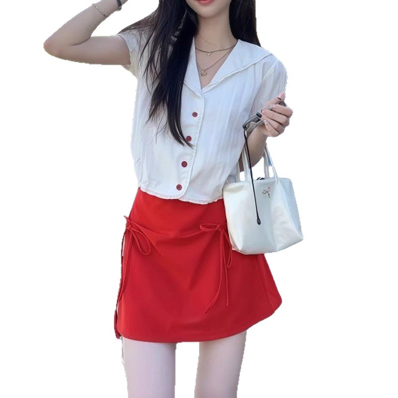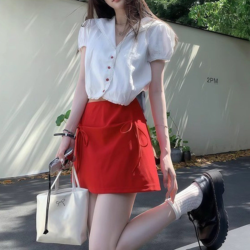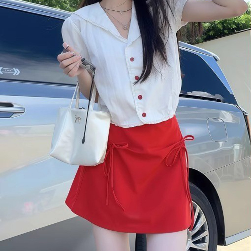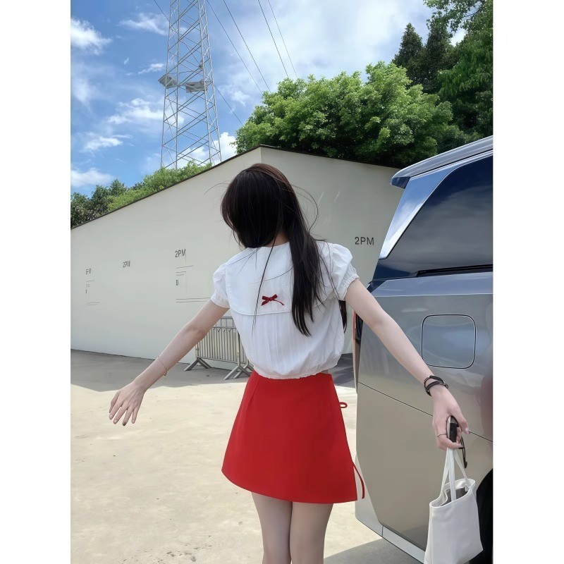 Главная страница > Летняя милая юбка А-силуэта, короткая юбка для женщин, новый стиль 2025 года, элегантный дизайн, универсальная красная юбка с бантом, модная