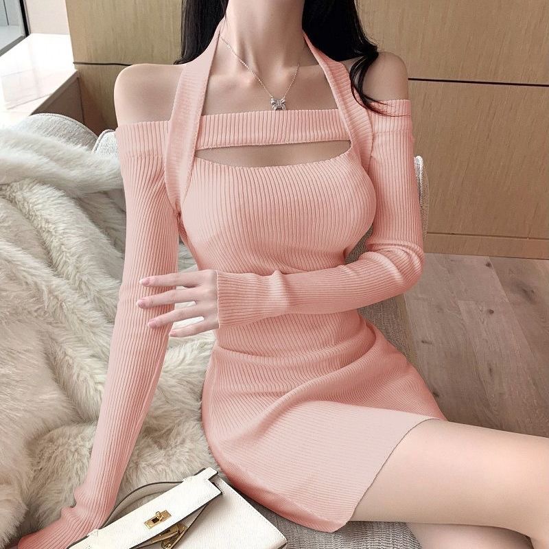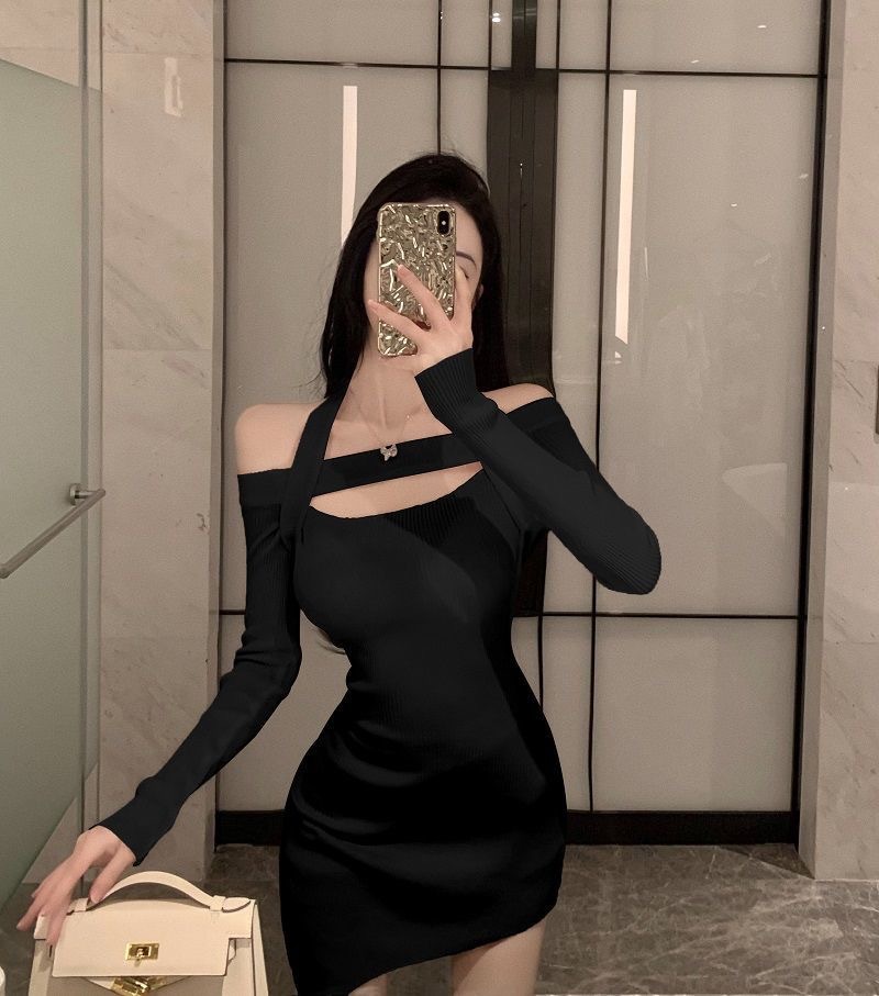 Главная страница > Сексуальное базовое трикотажное платье с полым вырезом и открытыми плечами, женское весенне-осеннее внутреннее узкое асимметричное юбка в области бедер