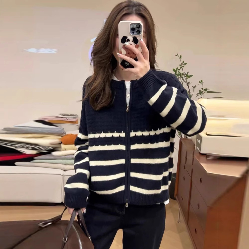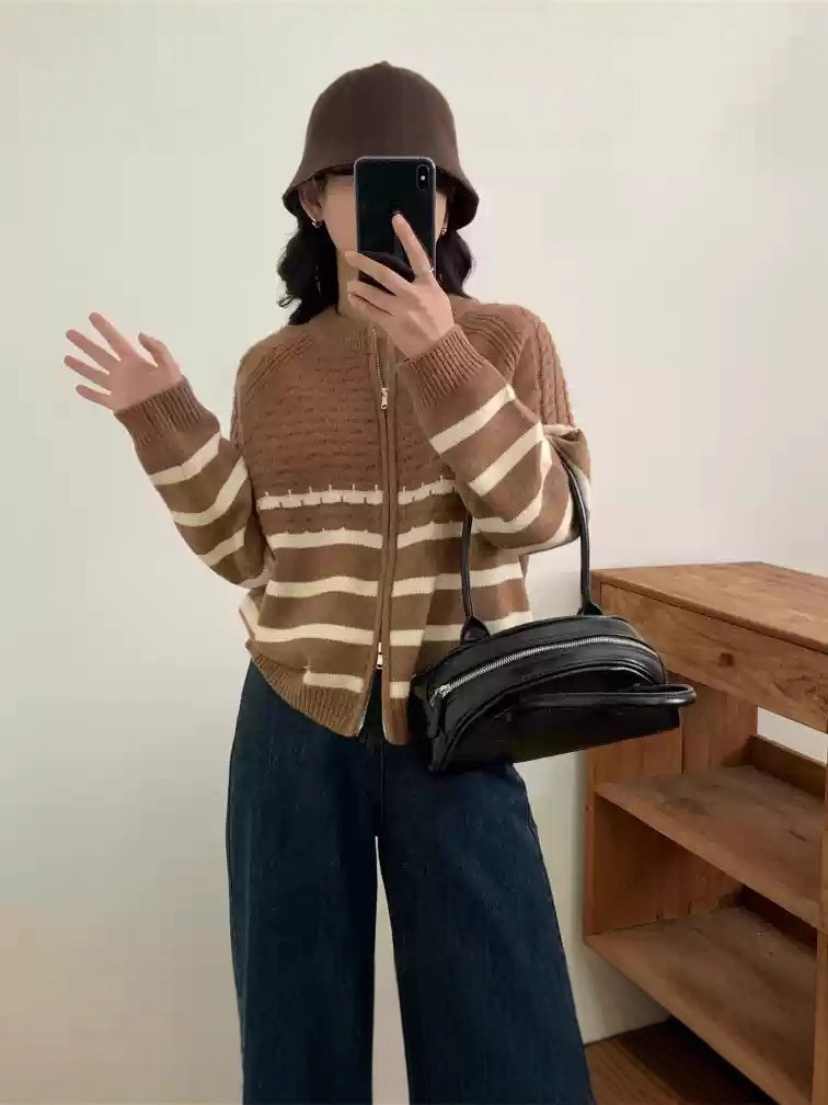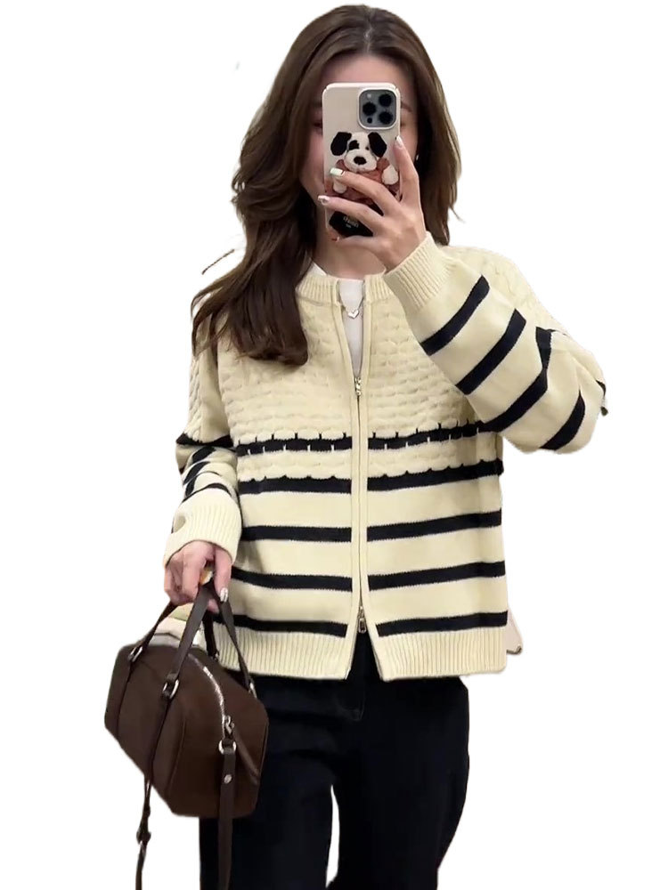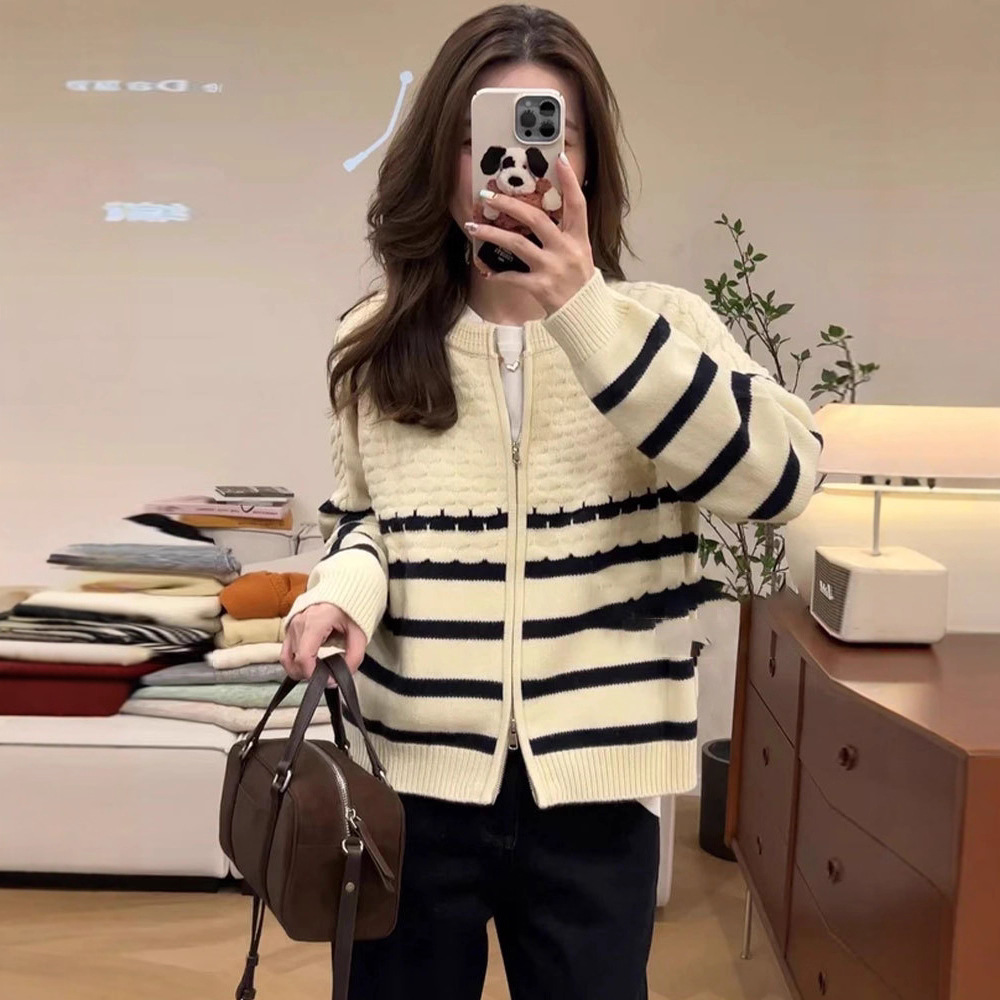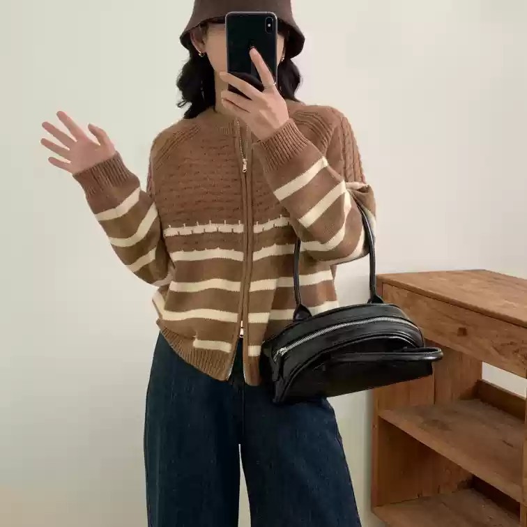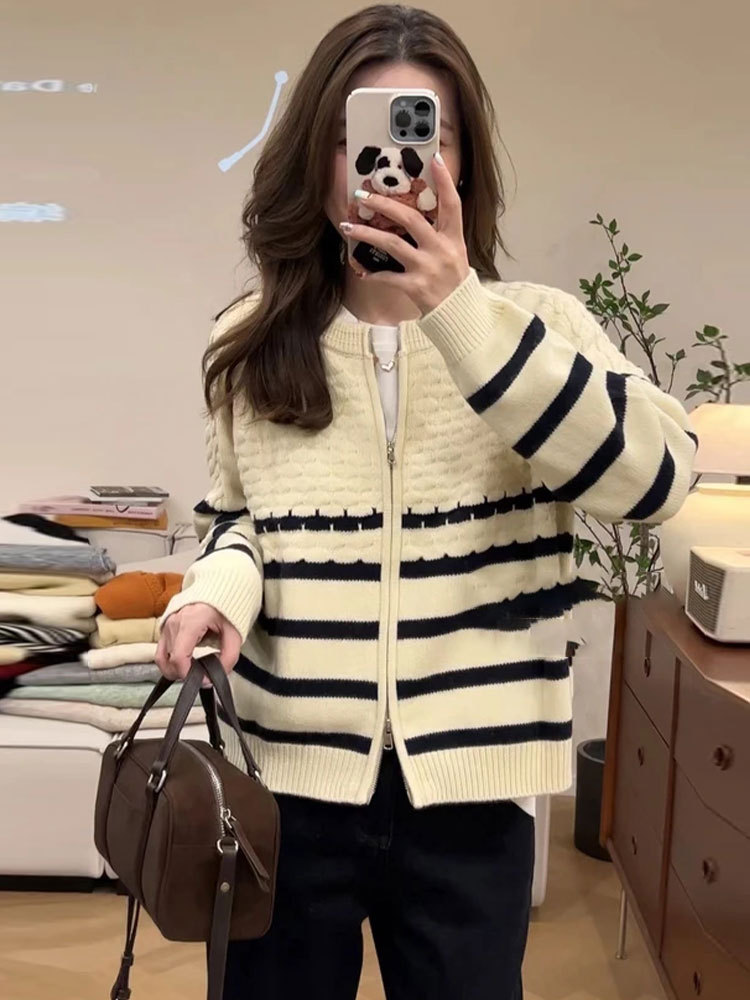 Главная страница > Твидовый дизайн, полосатый свитер с рукавами реглан на молнии, женская куртка, свободный утягивающий повседневный вязаный топ в западном стиле
