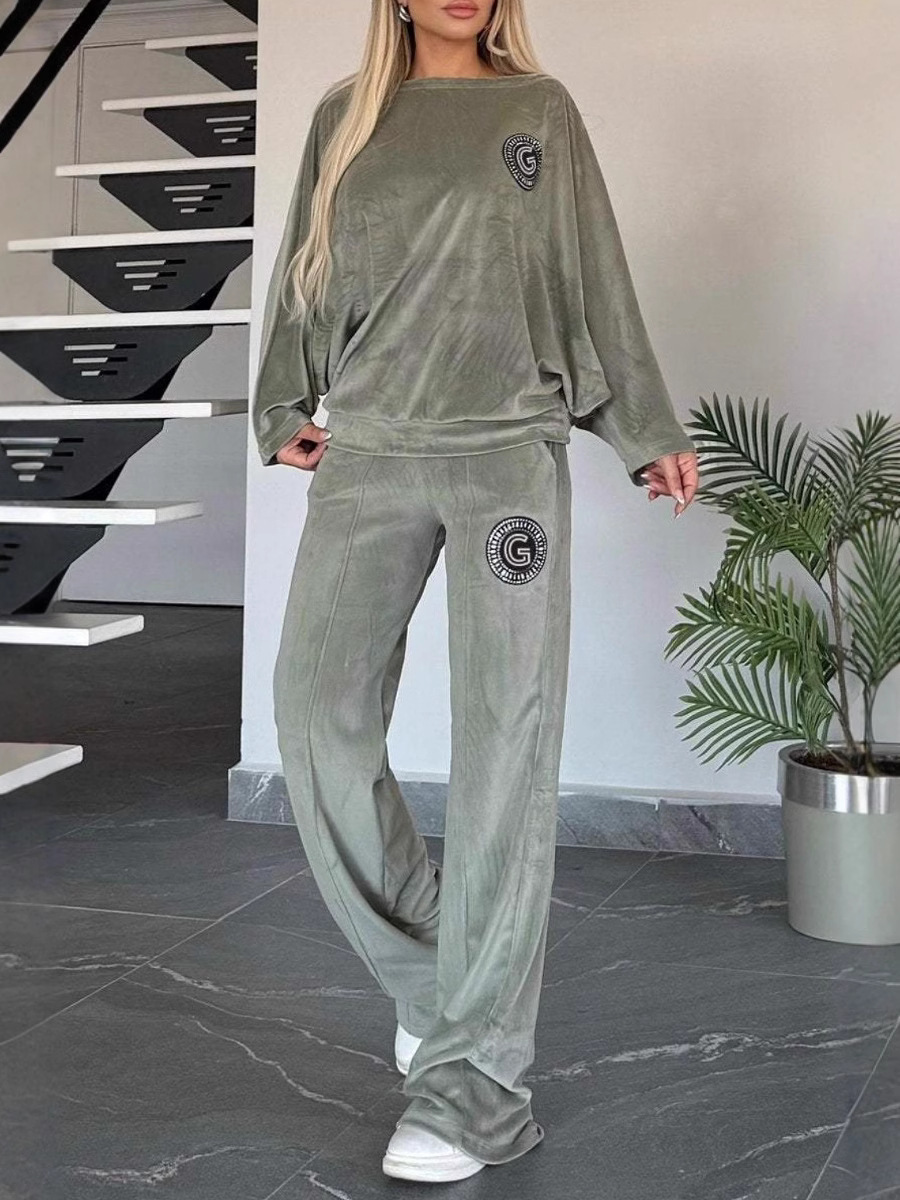 Главная страница > 2024 Европейские и американские трансграничные взрывные женские весенние и осенние золотые бархатные сплошные круглые швы летучей мыши рукава повседневная женская одежда из двух частей