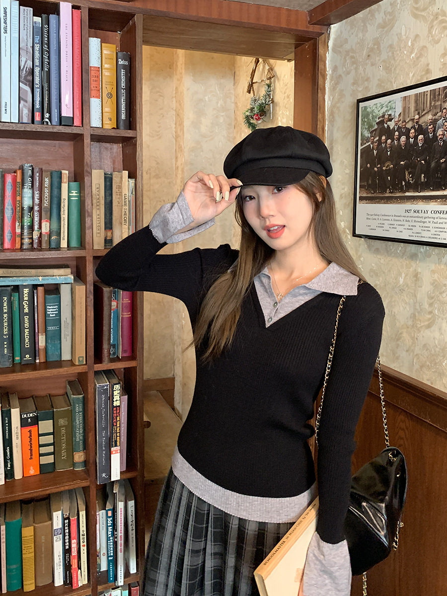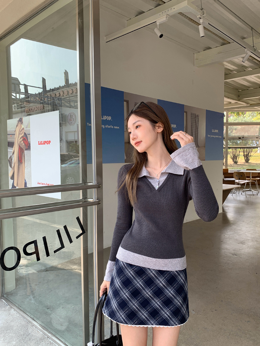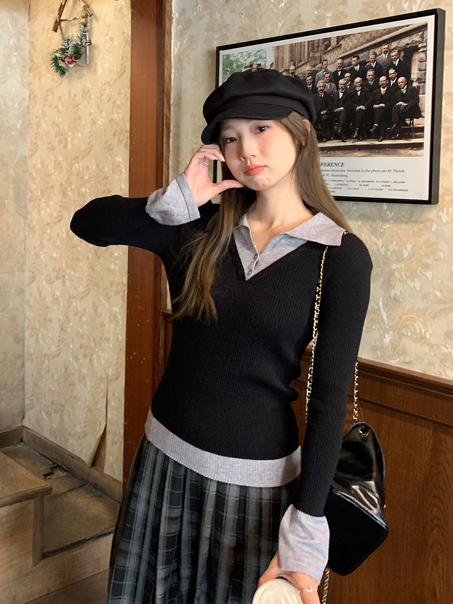 Главная страница > Новый контратаный цвет поддельный трикотажный нижний свитер из двух частей Женское весеннее платье с воротником Polo с длинными рукавами темпераментный свитер топ
